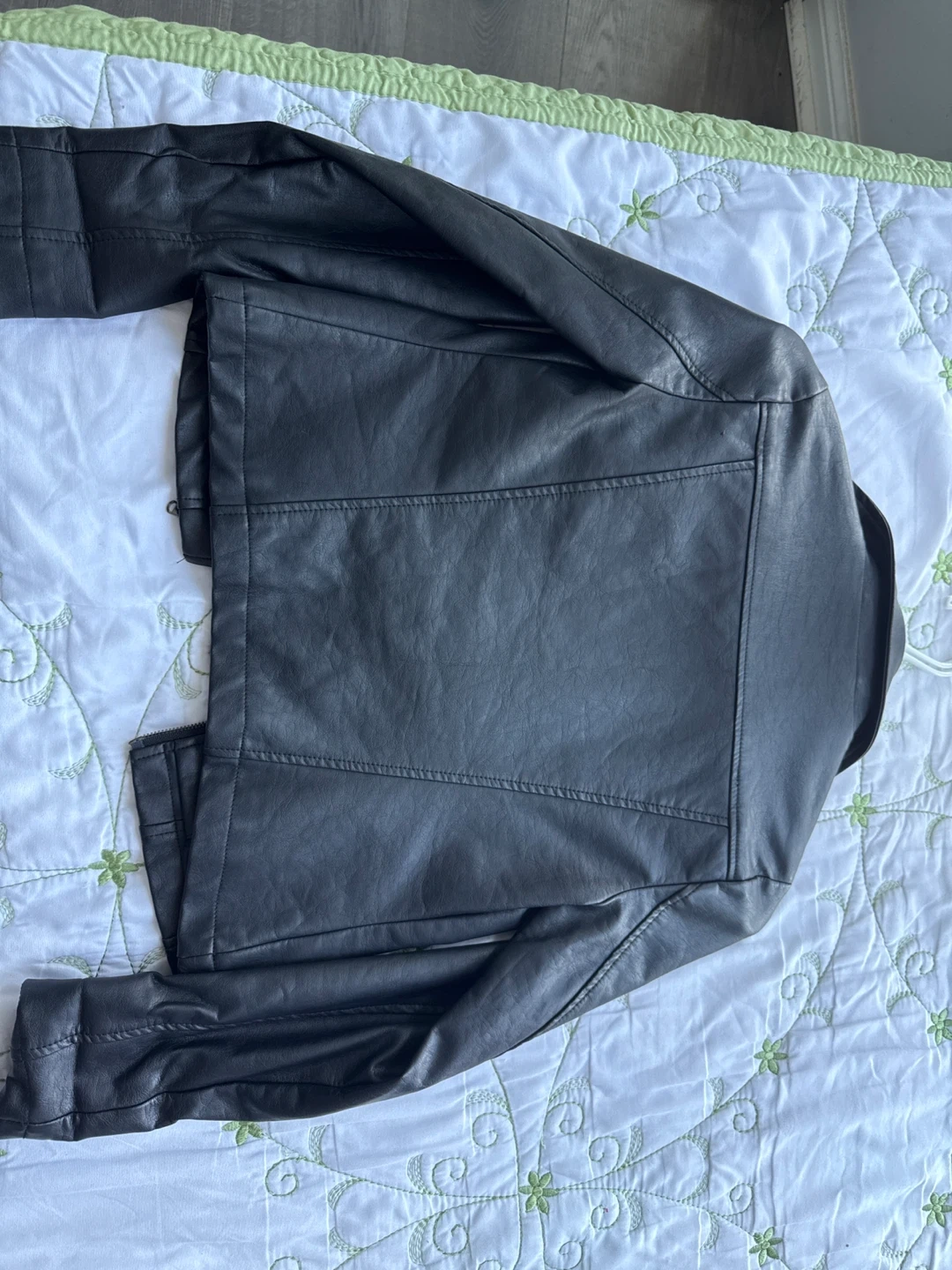 Selling a stylish black faux leather jacket from Justice, size medium. It features cute star embellishments on the front. Perfect for adding a bit of edge to any outfit!