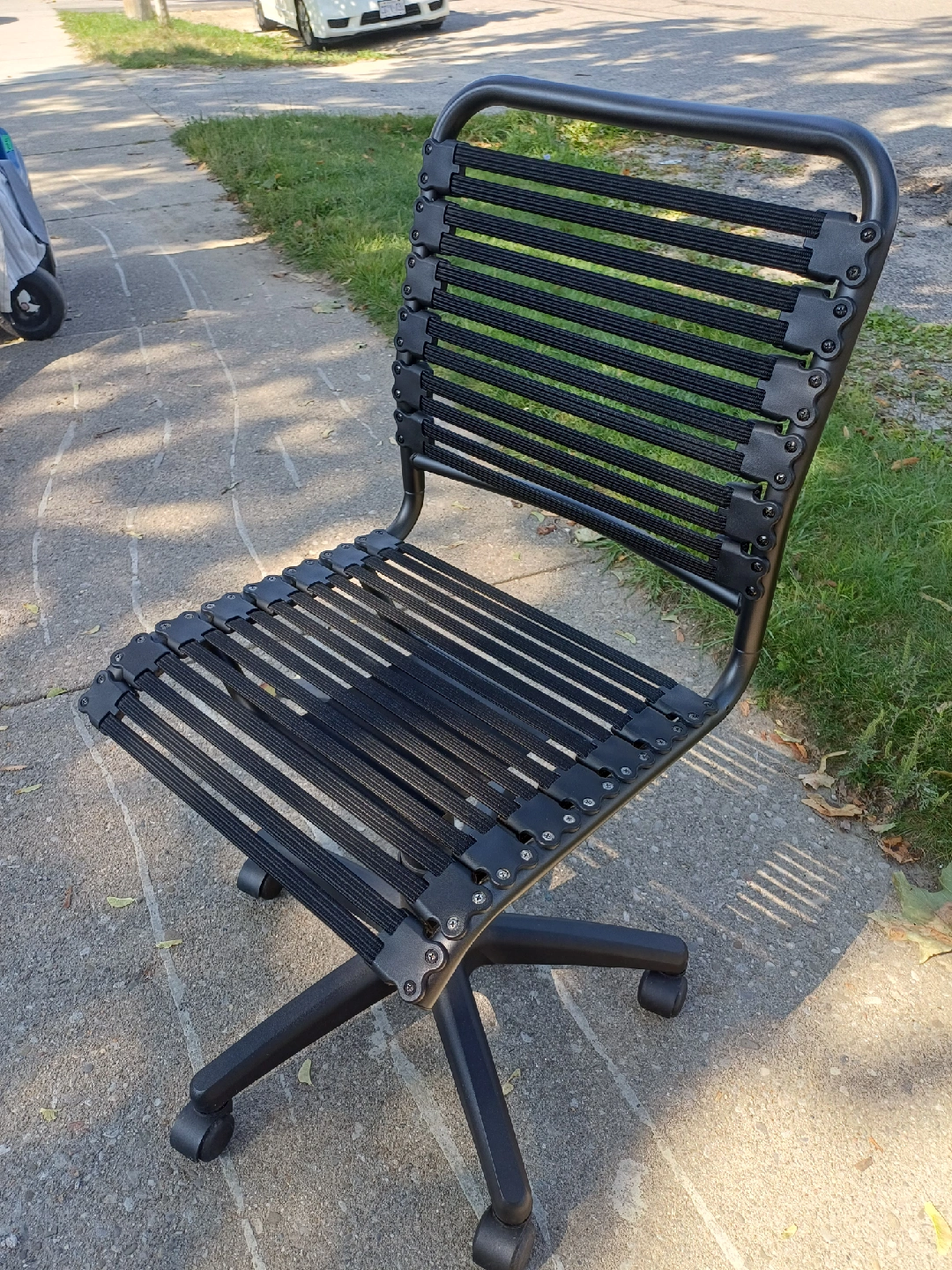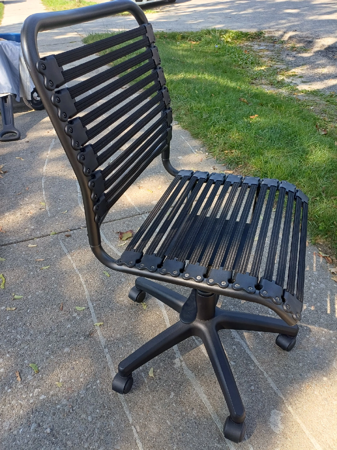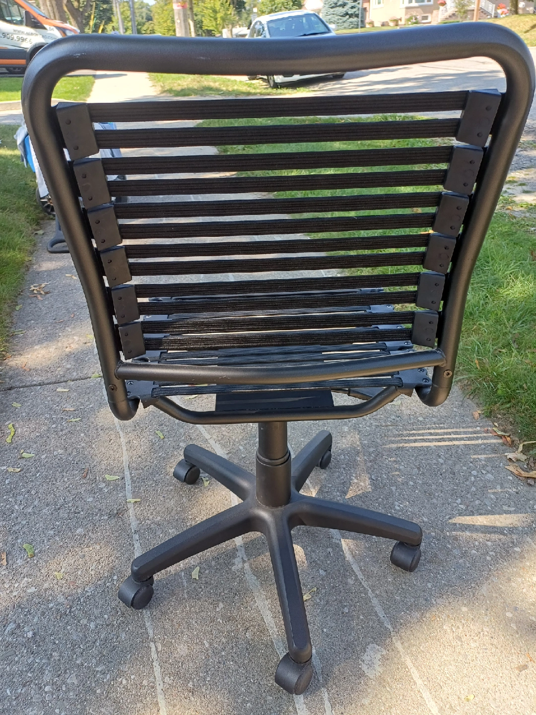 Black office chair. It's in great shape and ready for a new home office! The model number is TWIG720 and the reference number is EURO 12540BLK. It has a unique design with the black elastic bungee bands for the seat and back.