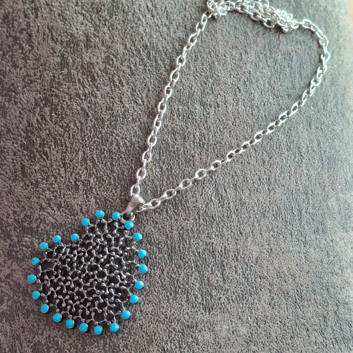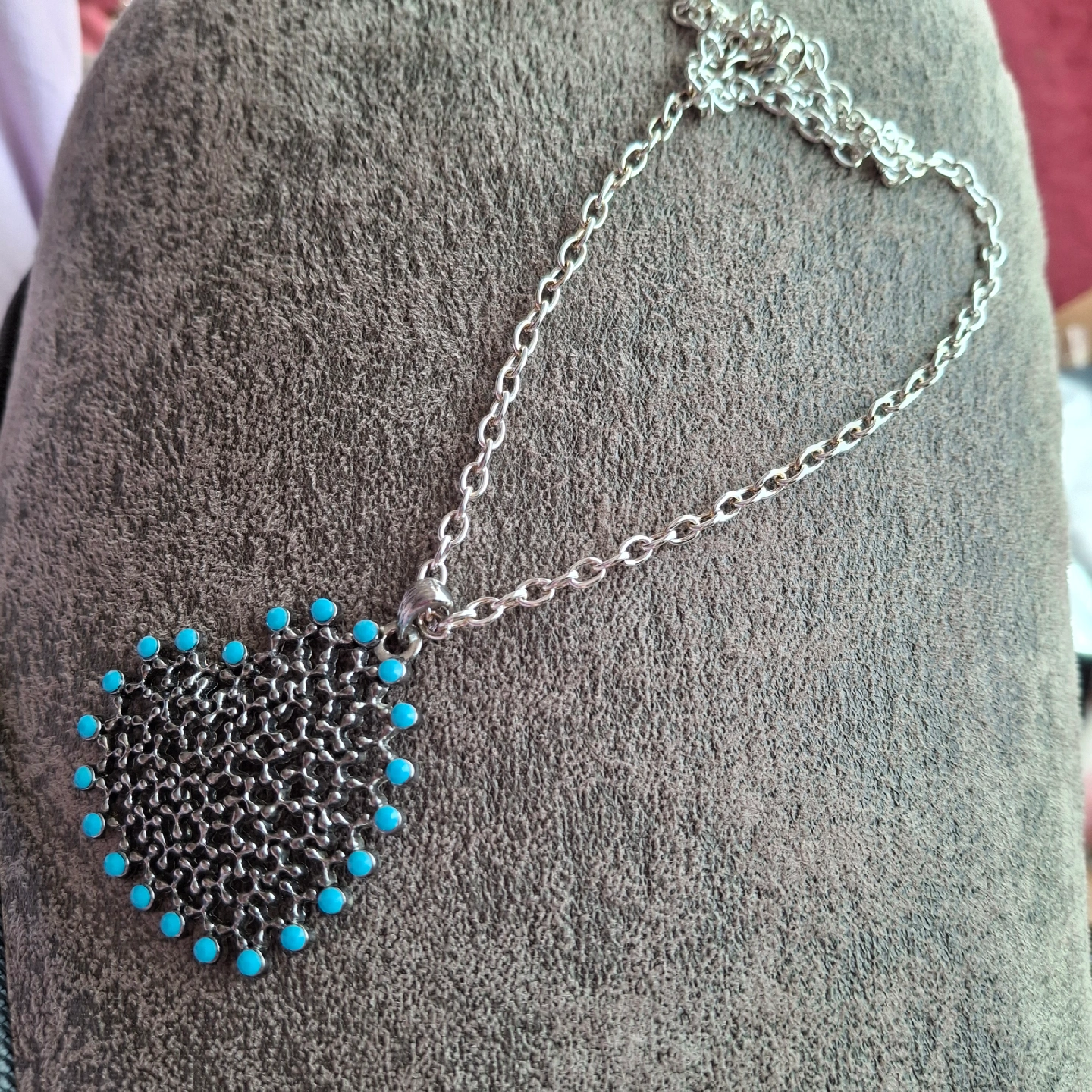 Selling a lovely silver necklace featuring a unique heart pendant adorned with turquoise-coloured accents. This necklace adds a touch of elegance to any outfit. Perfect for adding a pop of colour!