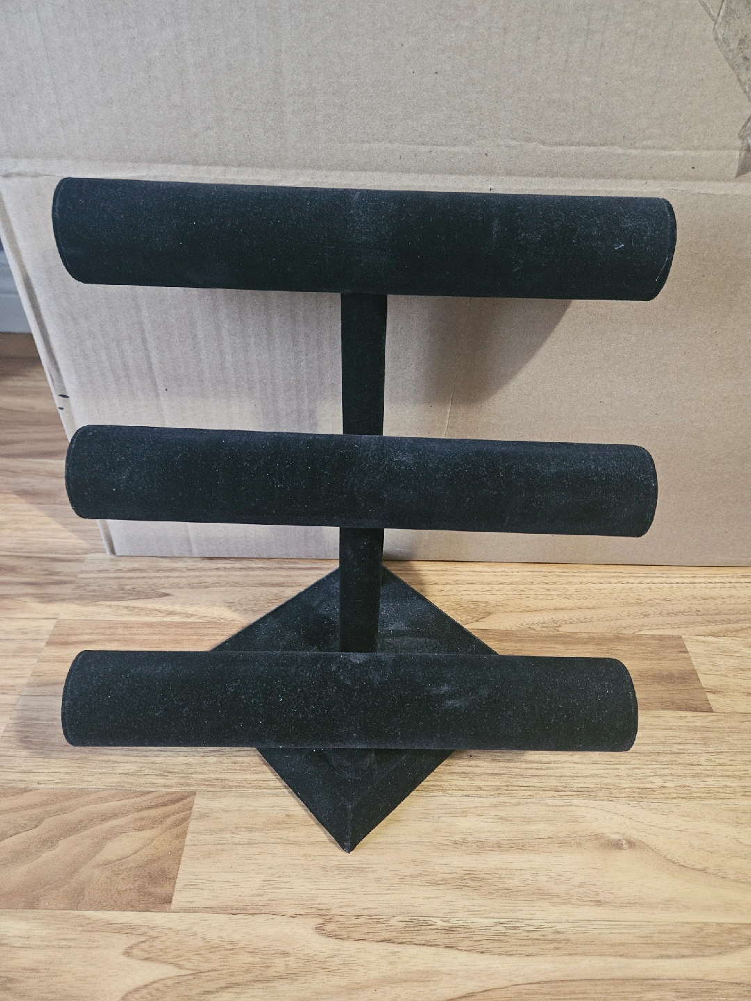 Here's a black velvet jewelry display stand with three tiers! It's perfect for showcasing bracelets, necklaces, or watches. It's in great condition and ready to help organize your accessories