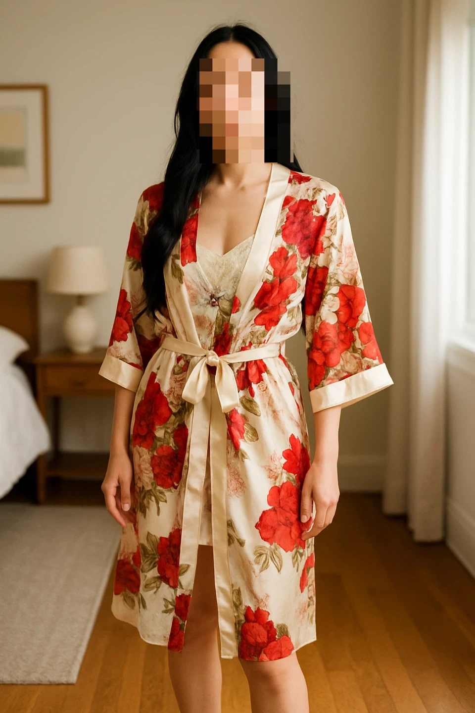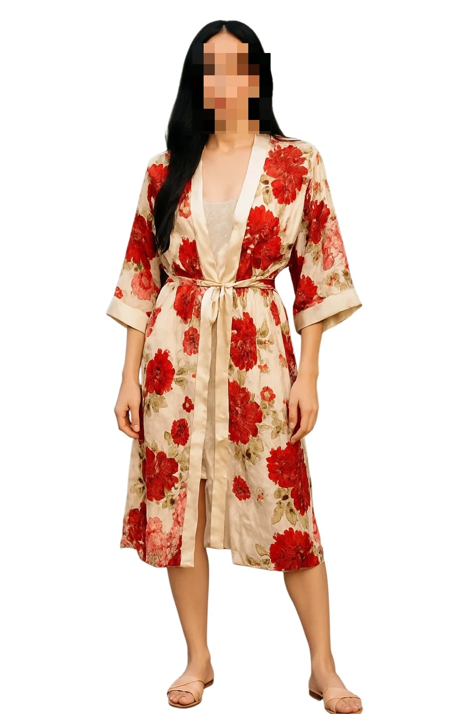 Women beautiful satin robe with a matching slip. The robe is a cream colour with large floral patterns, and the slip has delicate lace trim. The entire set is great for lounging around at home. Brand New, comes with attached tags.