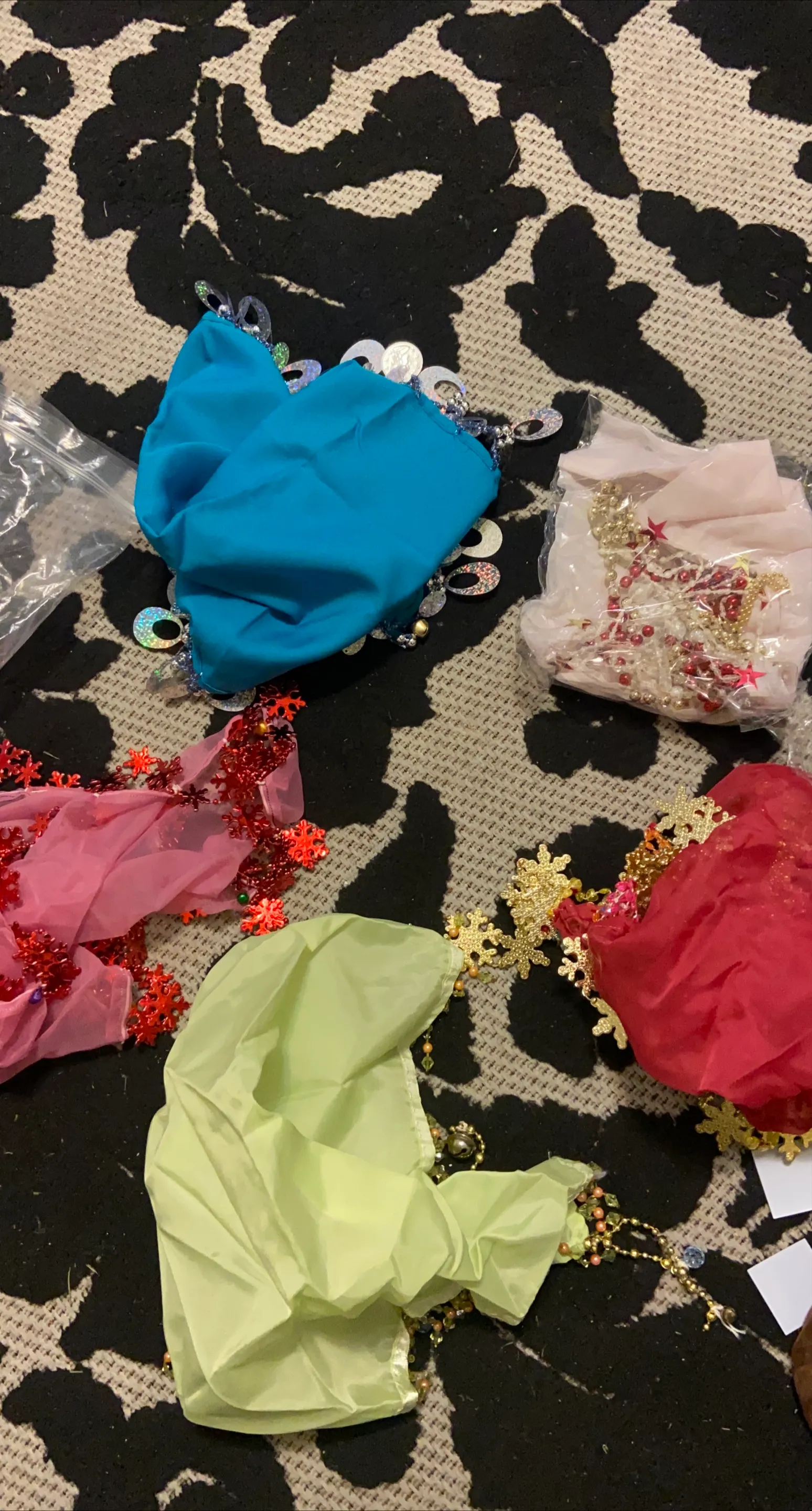 6 colourful dance costume fabric and embellishments! There's blue, pink, red, and light green fabric, along with various beaded and sequined trims. Perfect for adding some sparkle to your next dance creation