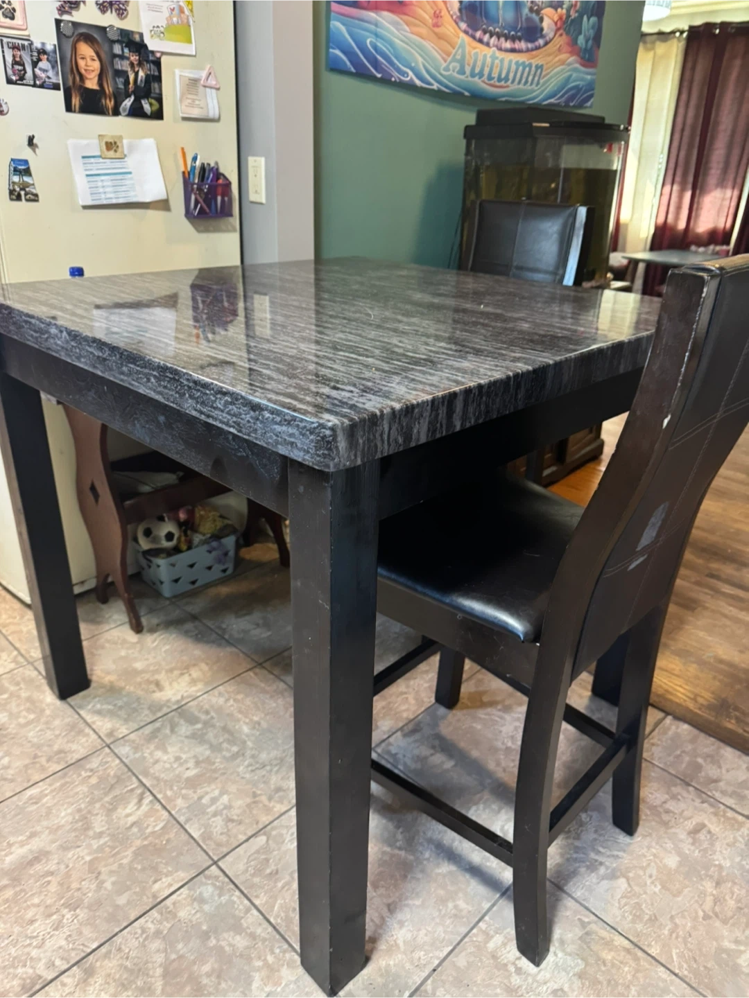 Selling a dining table set that includes two chairs. The table has a dark, possibly granite top and black wooden legs. The chairs are also black with padded seats. It's a sturdy set perfect for a kitchen or dining area!