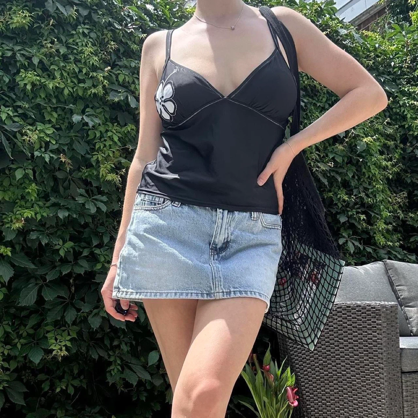 Black swimwear, floral detail, tankini top, two-piece swimsuit, beachwear, summer outfit, swim topline, black bikini, white flower pattern, poolside style