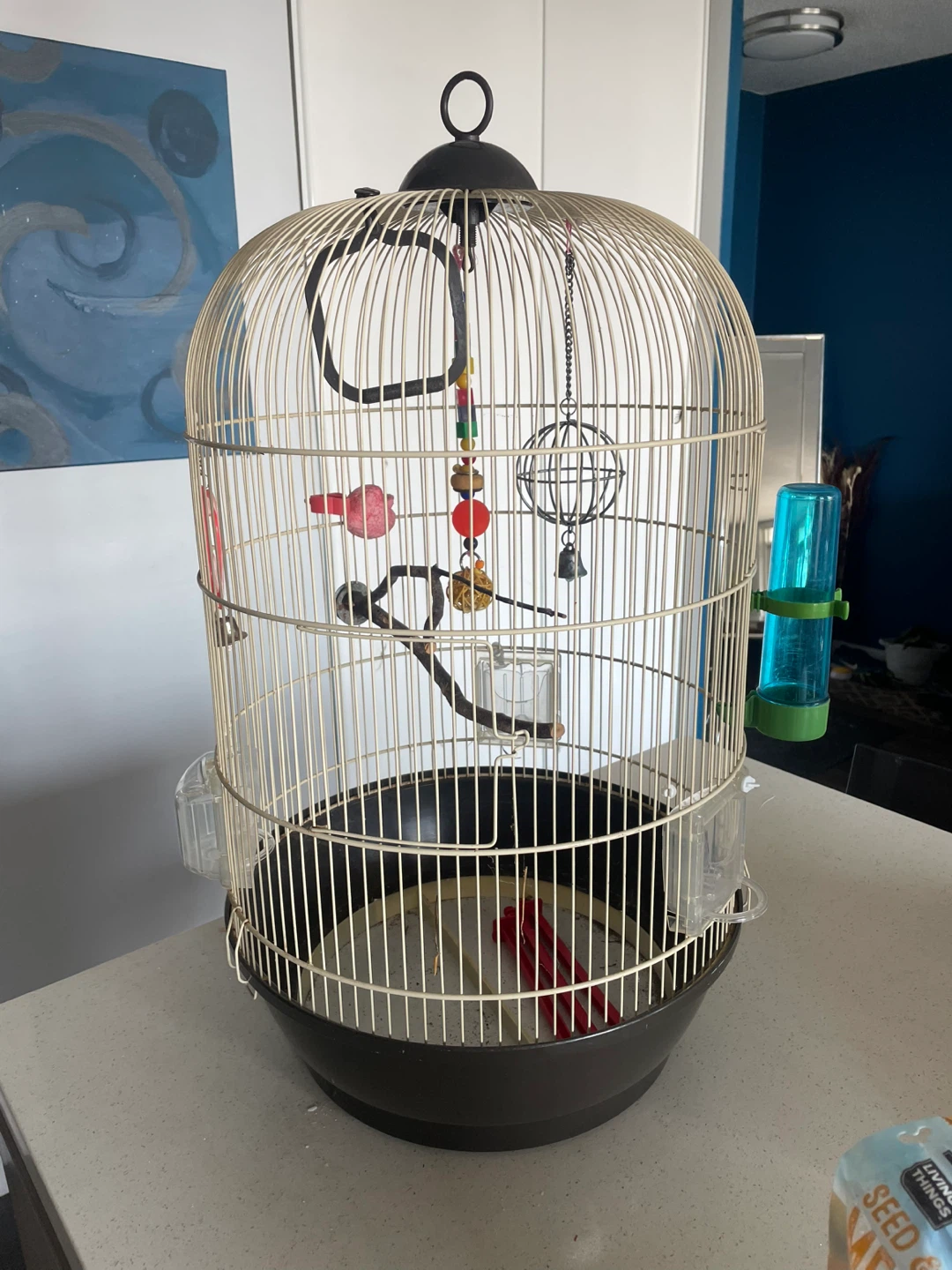 Selling a bird cage that's in good condition! It comes with some accessories, including perches, a water dispenser, and some hanging toys. It's a great home for your feathered friend.