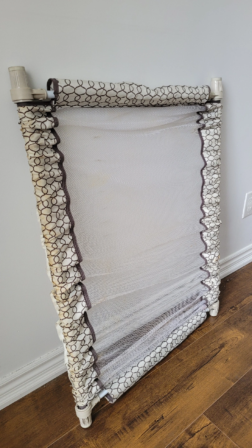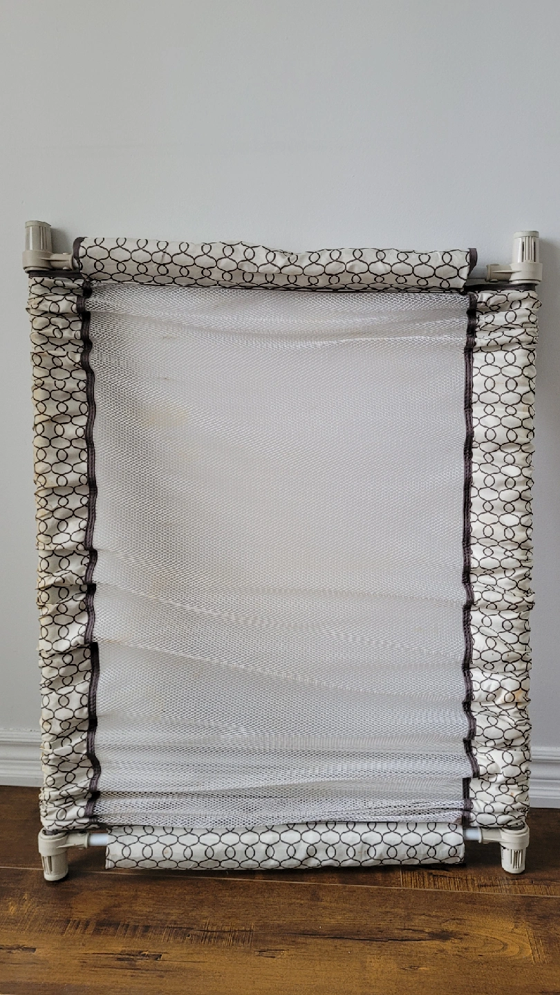 Selling a retractable baby gate in good condition! It features a white mesh and a patterned fabric border. Perfect for keeping your little one safe and secure!