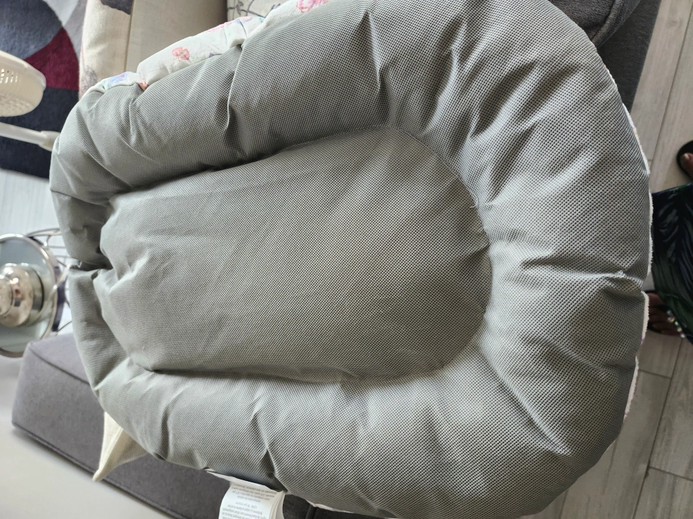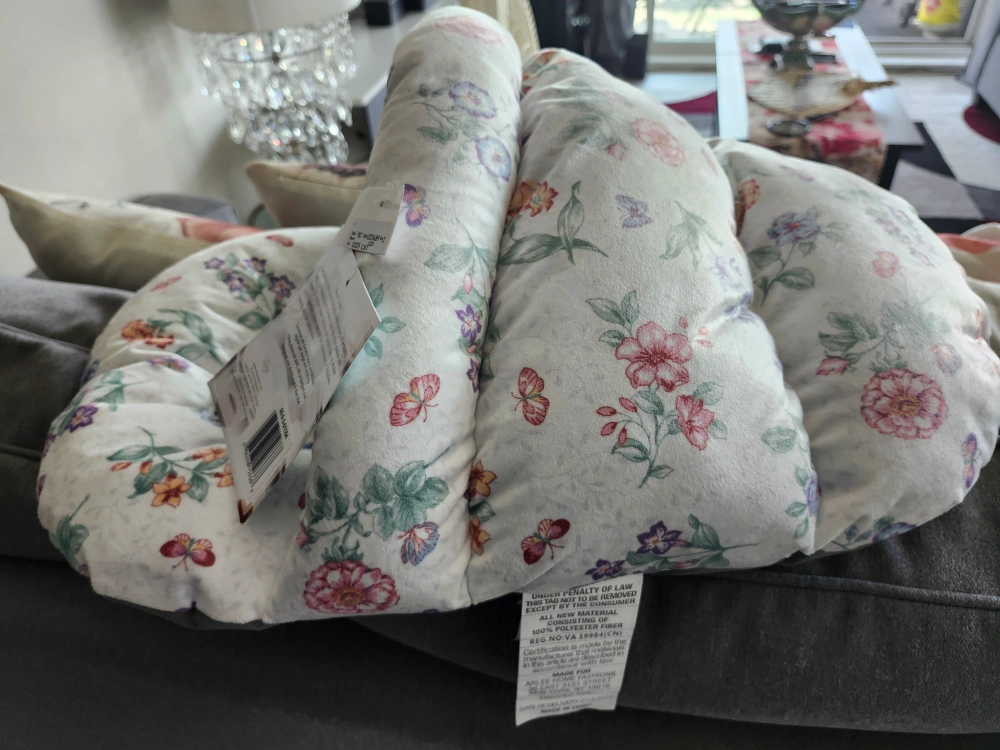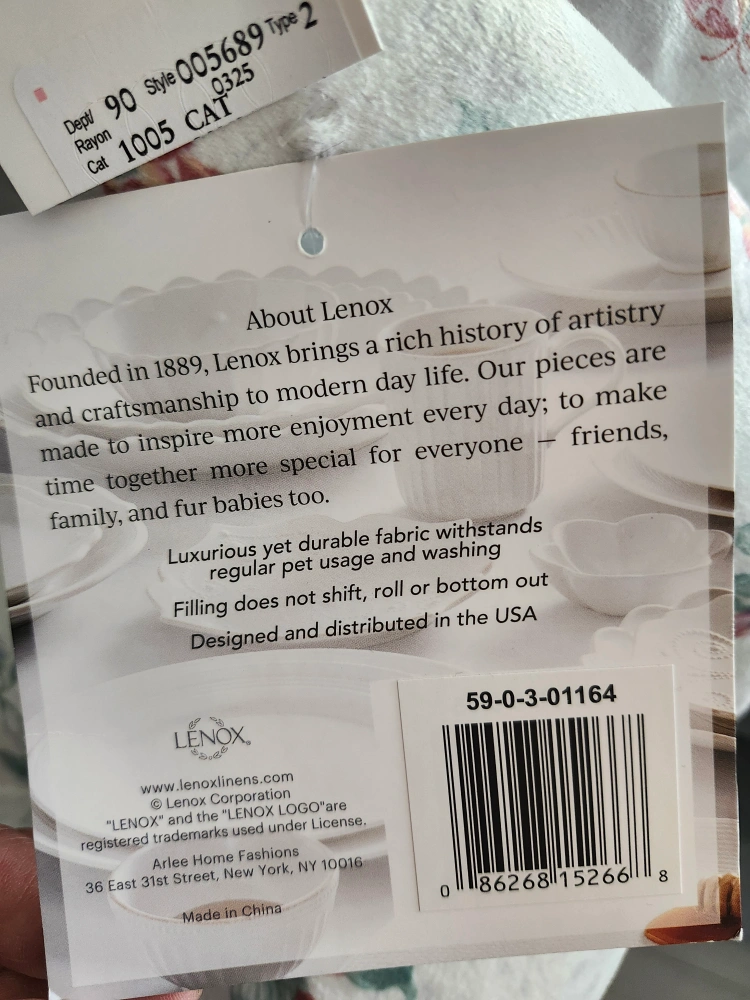 This is a Lenox Pet Collections bed, perfect for your furry friend! It's 26 inches by 22 inches (66 cm x 56 cm). The bed features a luxurious yet durable fabric that withstands regular pet usage and washing. It's designed and distributed in the USA, and the filling does not shift, roll, or bottom out! The bed has a pretty floral pattern on a white background