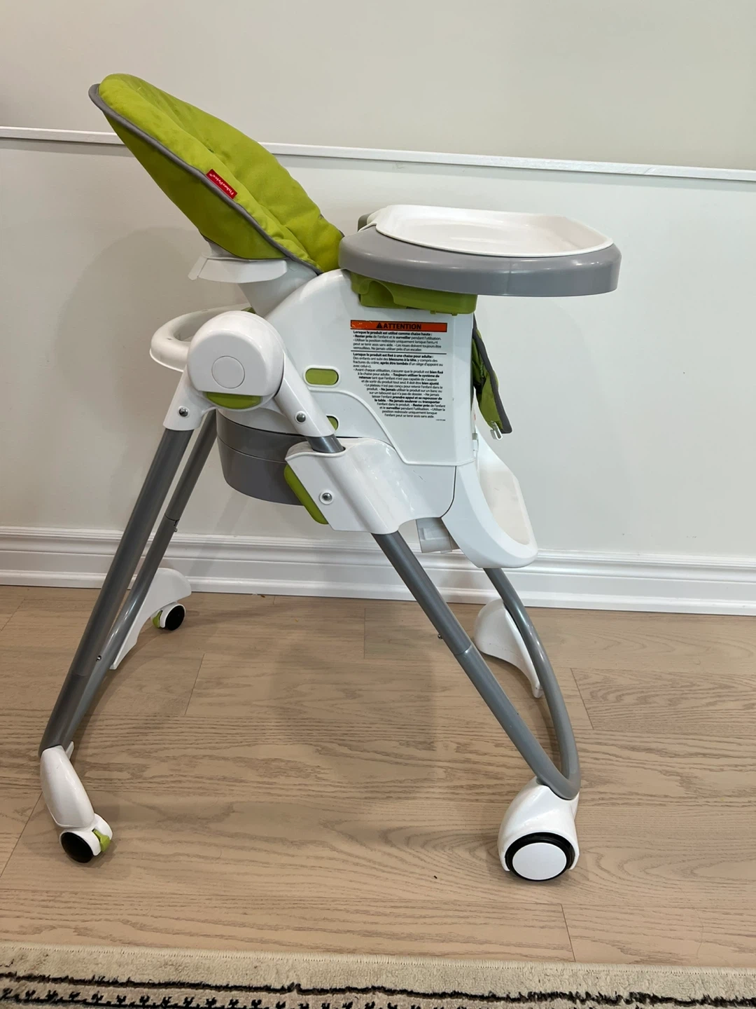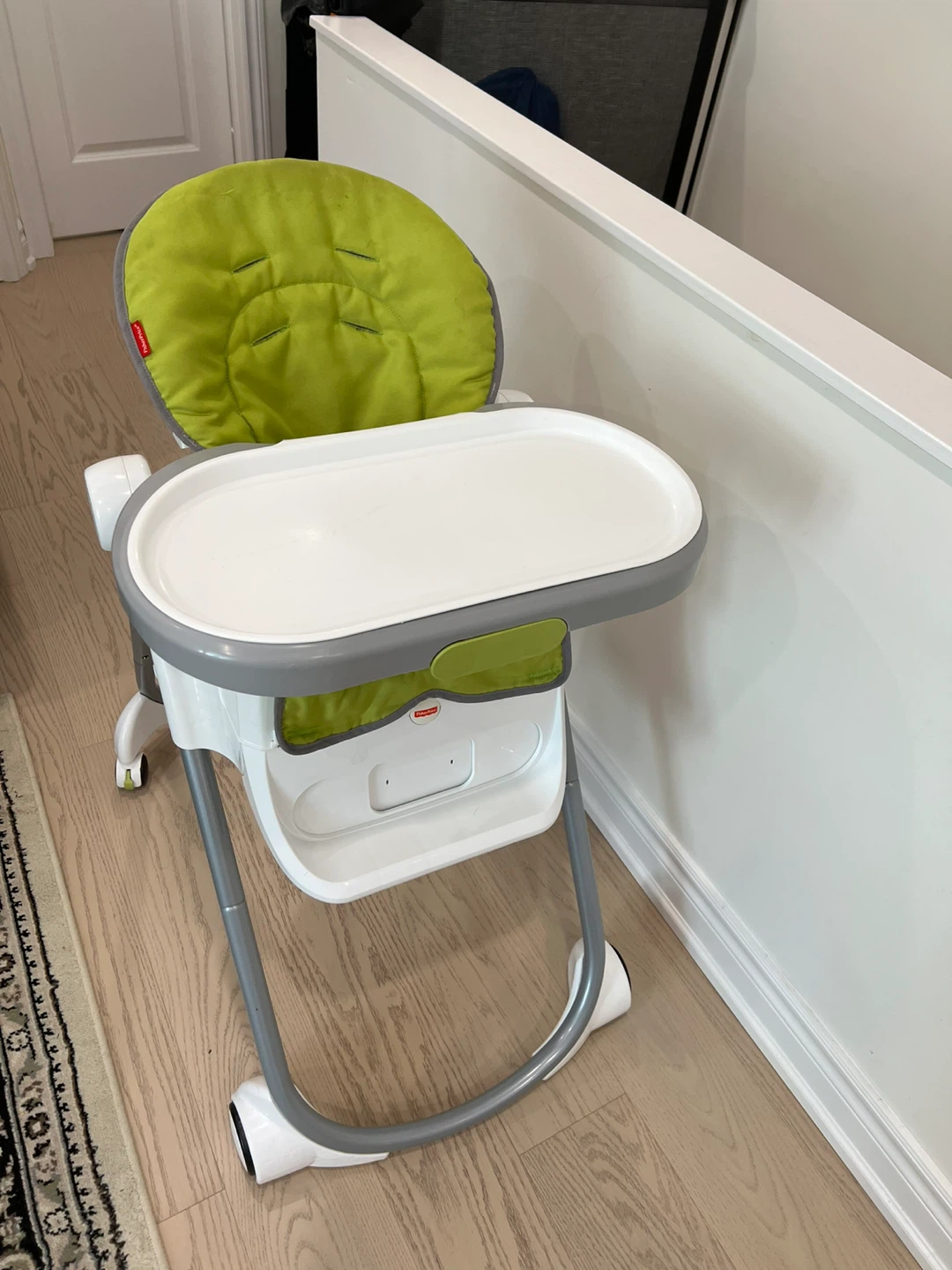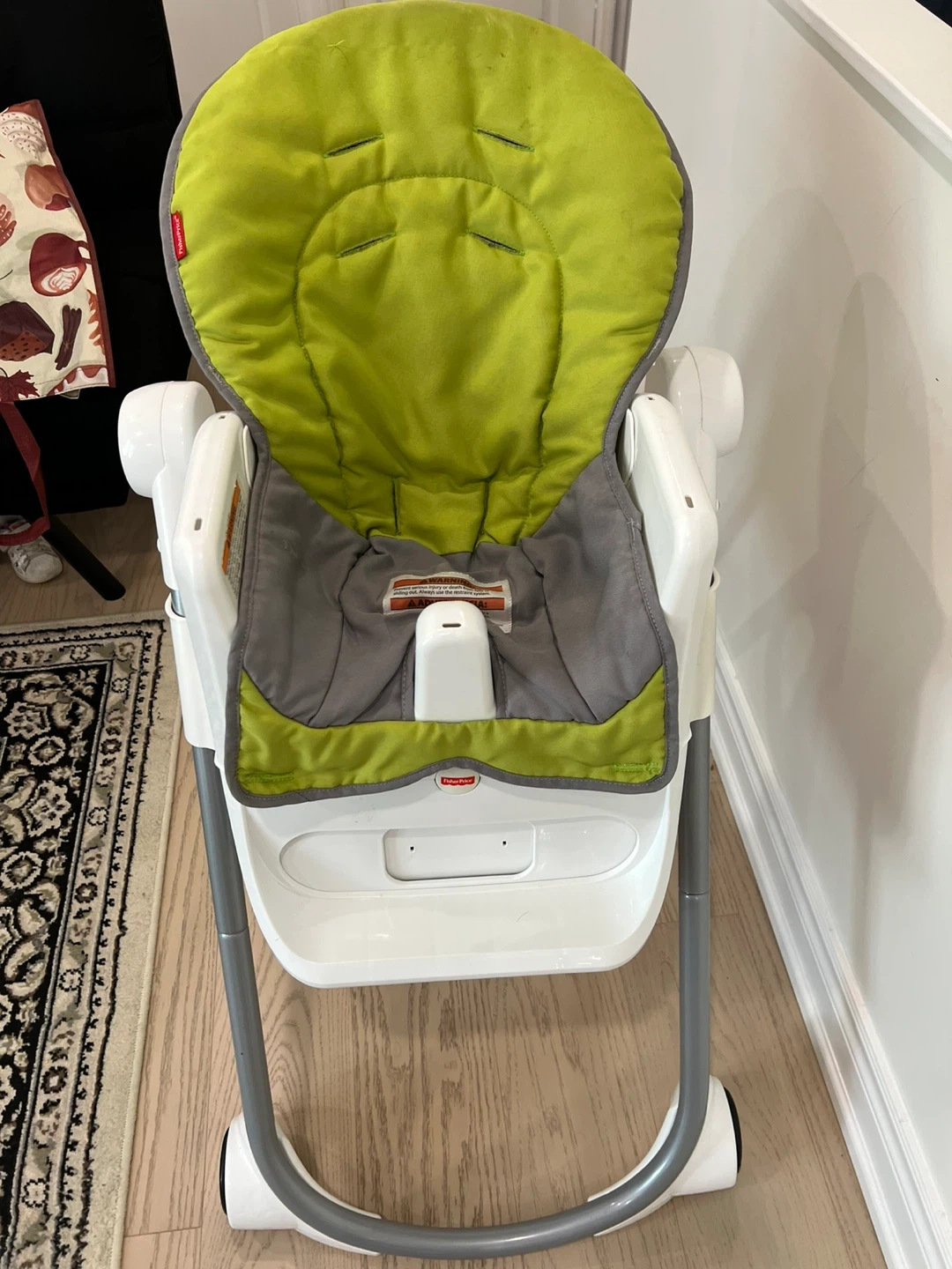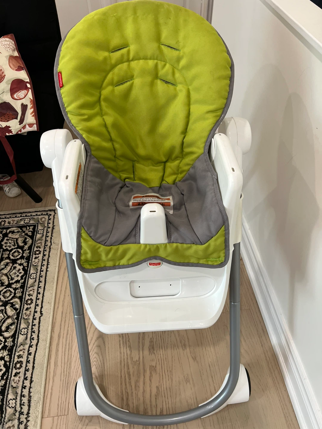 Selling a Fisher-Price high chair in a lovely green and grey colour scheme! It's in good condition and ready for a new home. Perfect for feeding time and keeping your little one safe and secure