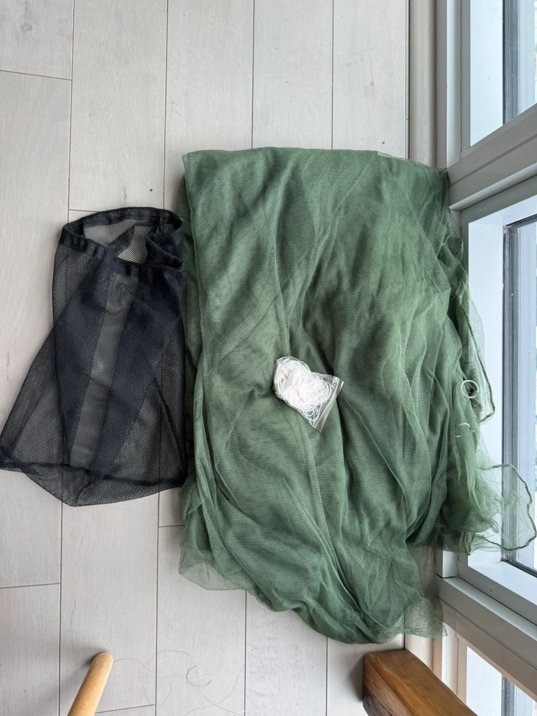 Selling a green mosquito net! It comes with a carrying bag and some string for hanging it up. Perfect for keeping those pesky bugs away during the summer evenings