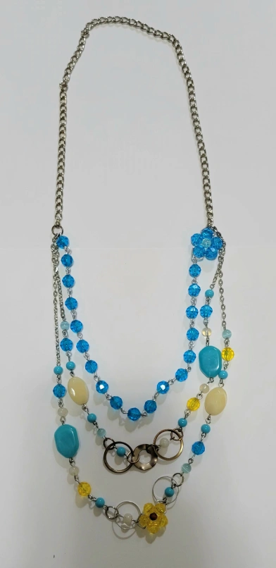 This is a lovely beaded layered necklace. It features blue, yellow, and white beads with silver-tone chains. The necklace has a unique design with flower and circle accents.