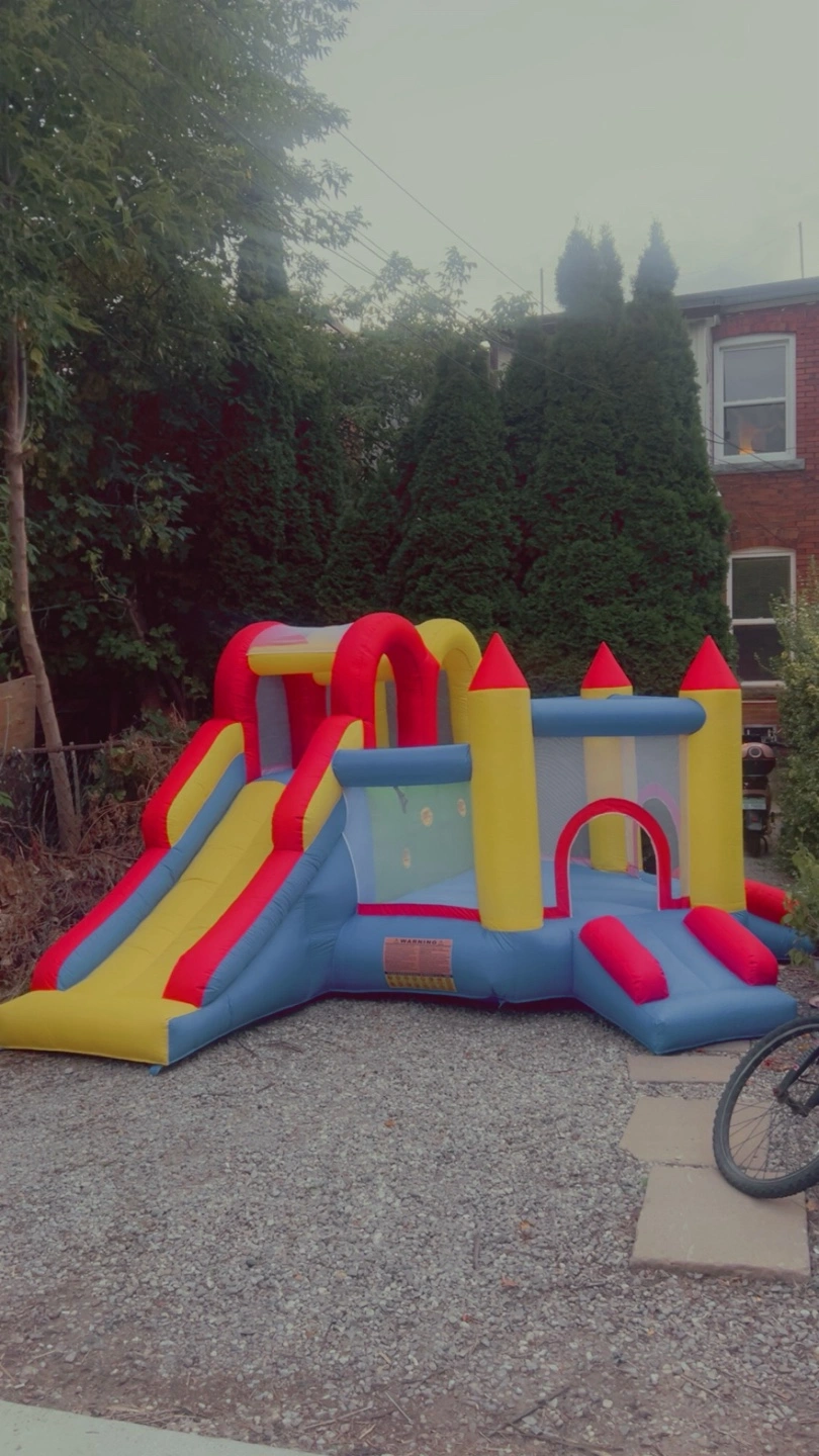 This inflatable castle bouncer with a slide is perfect for kids! It's brightly coloured with red, yellow, and blue accents. Great for outdoor fun and exercise, it's sure to keep the little ones entertained for hours