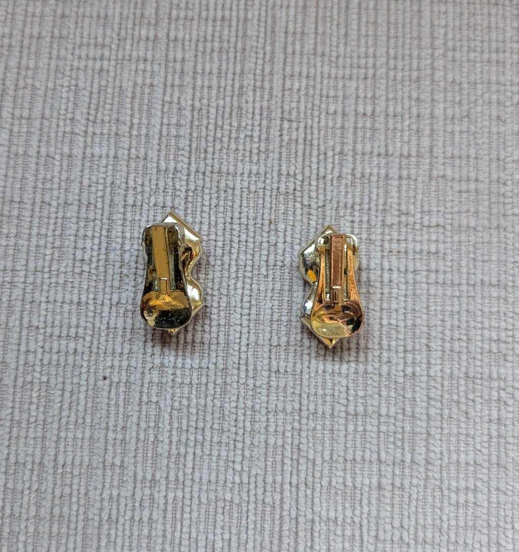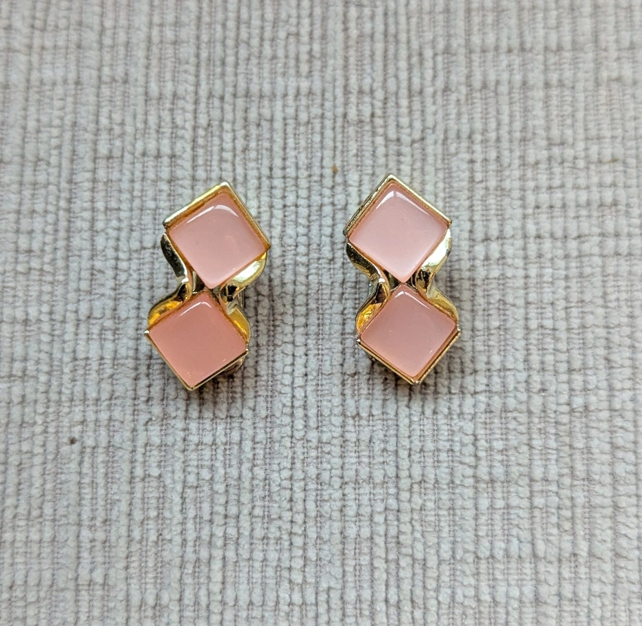 These are a pair of vintage clip-on earrings. They feature a gold-tone setting with two pink square stones. They're perfect for adding a touch of retro charm to any outfit