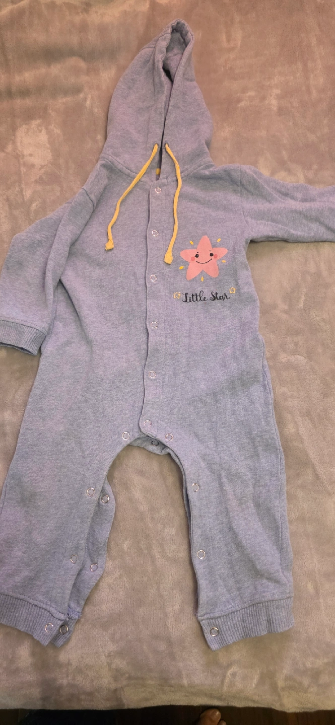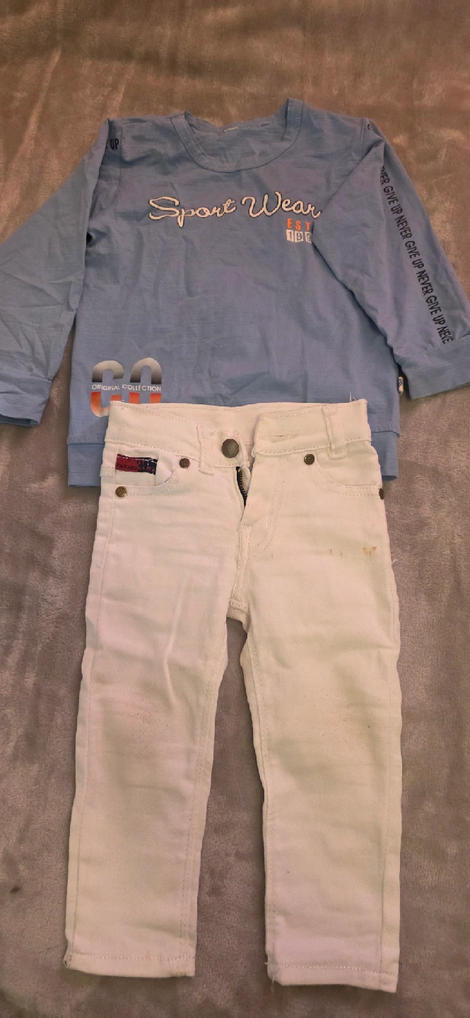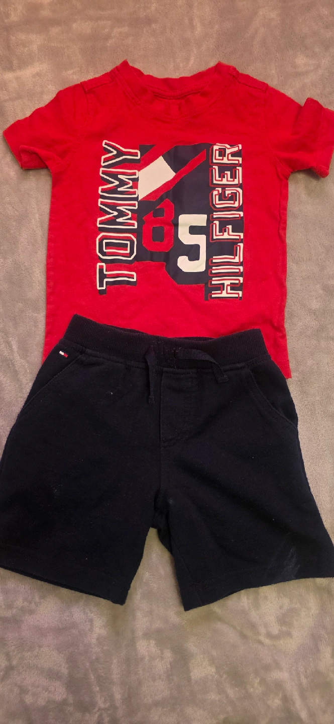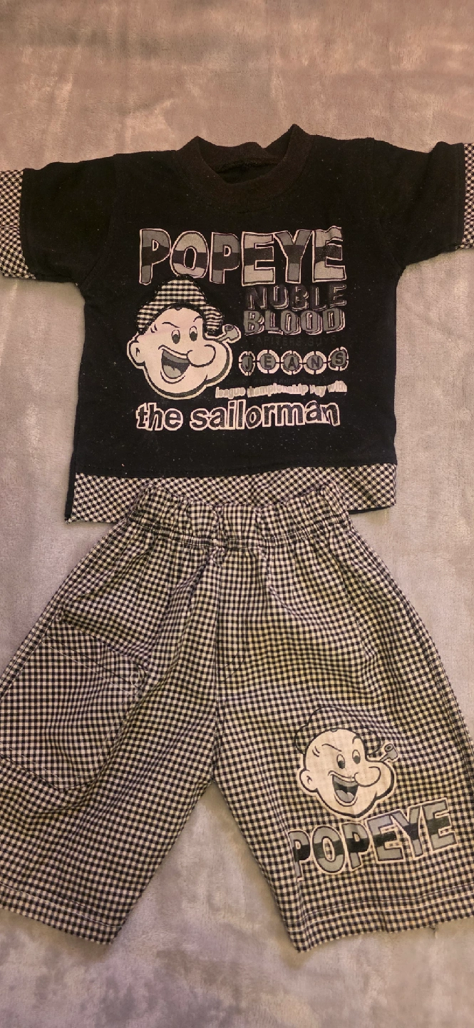 41A collection of baby clothing sets, including a blue long-sleeved shirt with white jeans, a Tommy Hilfiger red t-shirt with navy shorts, a Popeye-themed black t-shirt with checkered pants, and a grey hooded onesie. All items are in good used condition and ready for a new home! Perfect for mixing and matching. $10 each..