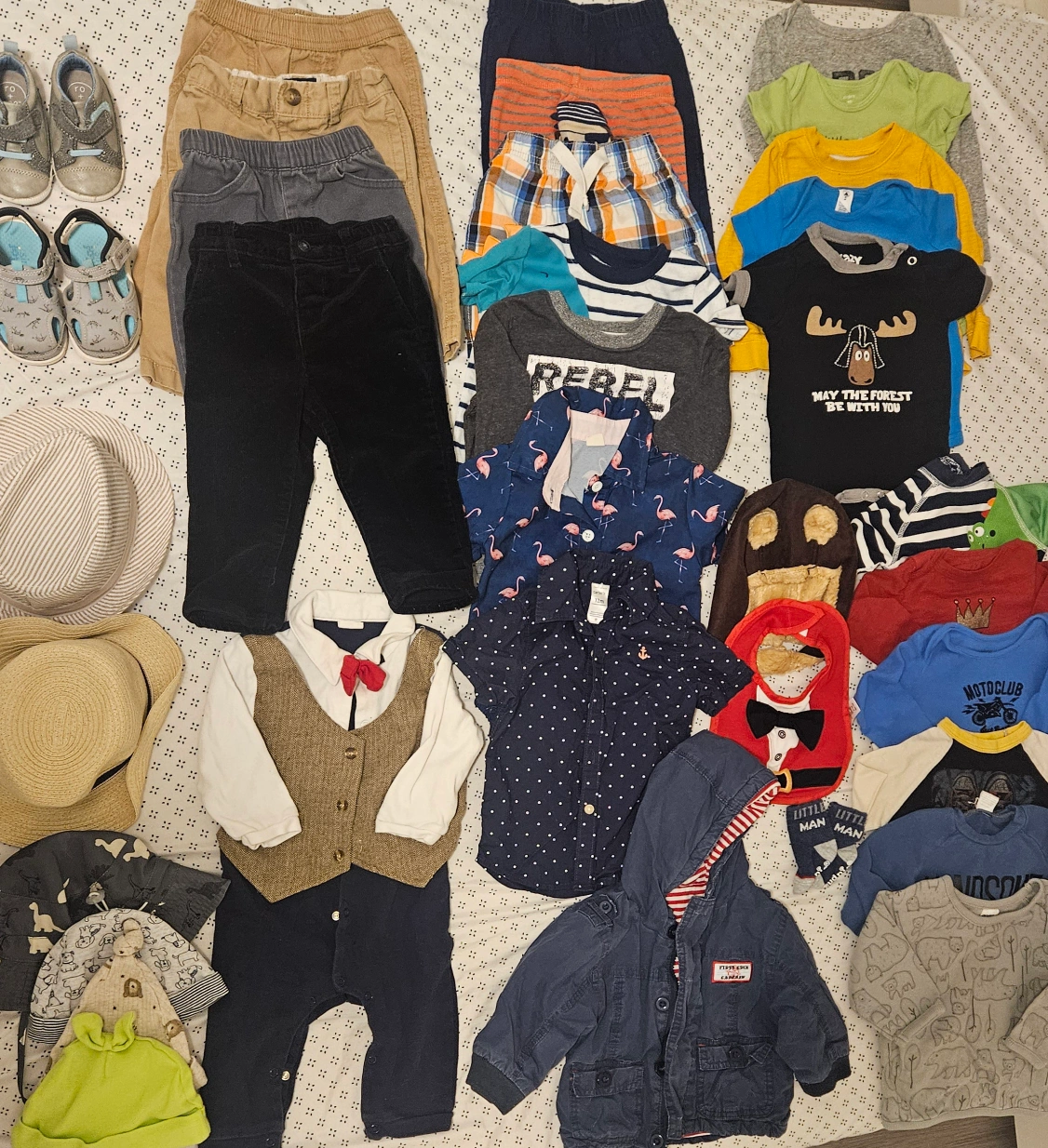 Bundle of baby boy clothes & accessories — jacket, onesies, pants, tops, hats, shoes & more. Sizes 6–12M & 12–18M. Clean & in great condition. Smoke-free, pet-free home.
