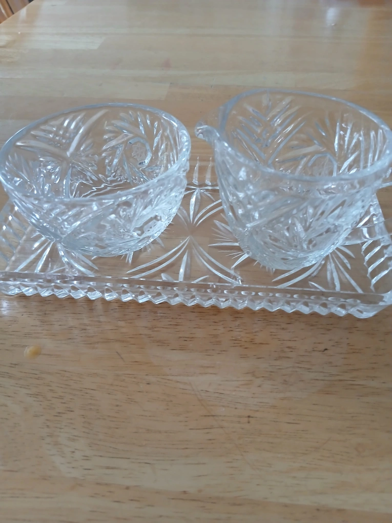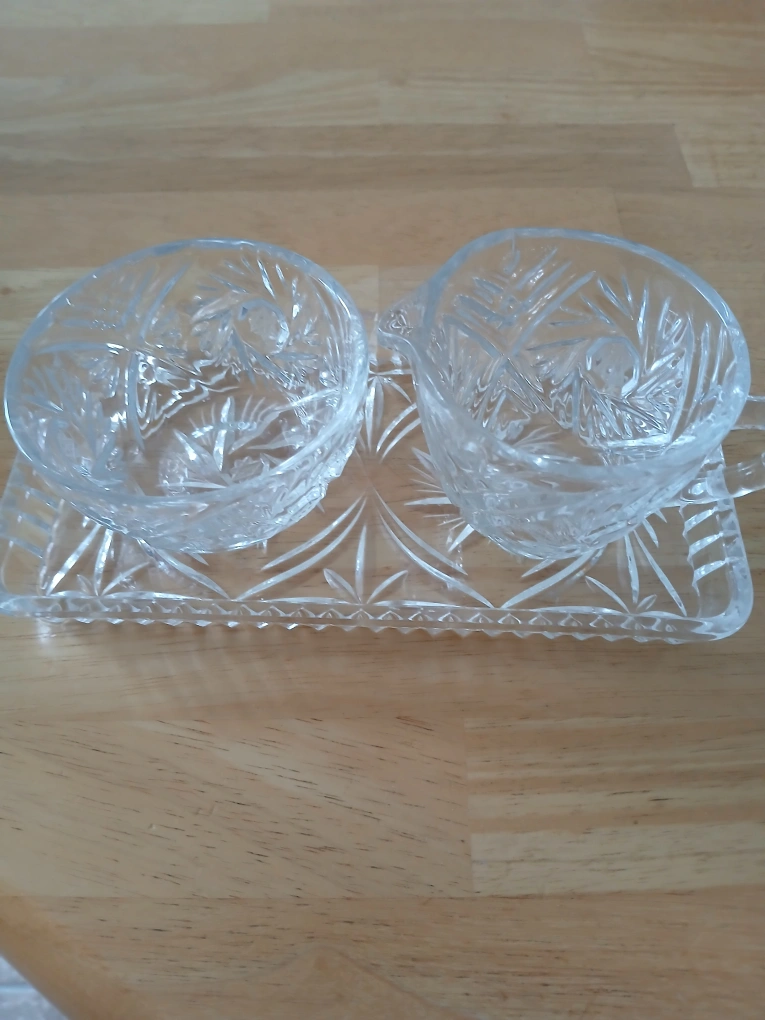 Selling a beautiful crystal sugar bowl and creamer set. It has a lovely intricate design. Perfect for adding a touch of elegance to your table!
