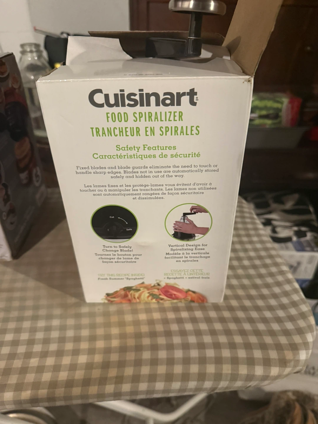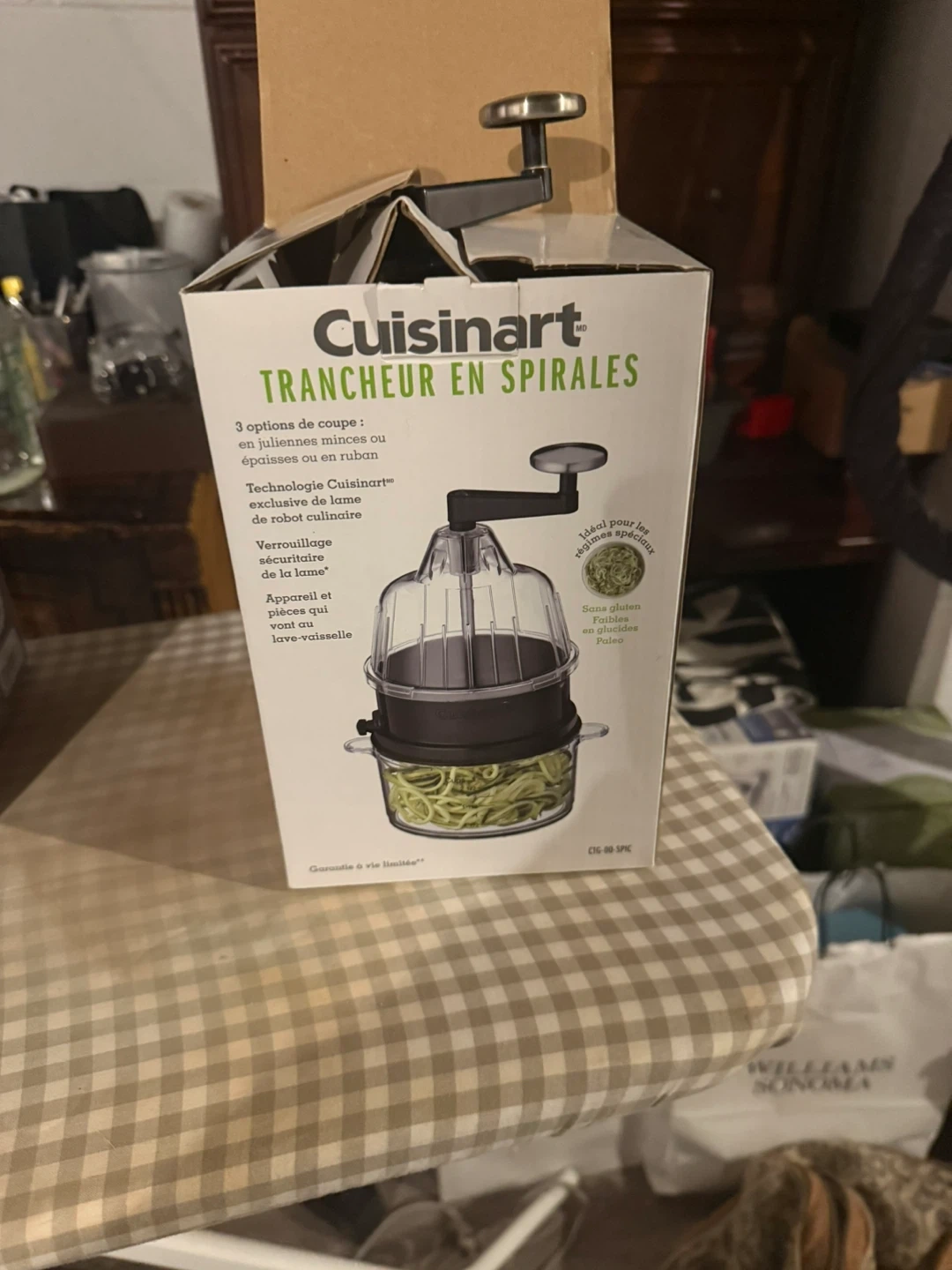 Selling a Cuisinart Food Spiralizer in excellent condition! It comes with the box. It has 3 cutting options: thick or thin julienne or ribbon slice. It also features exclusive Cuisinart blade technology, a safe blade lock system, and is dishwasher safe!