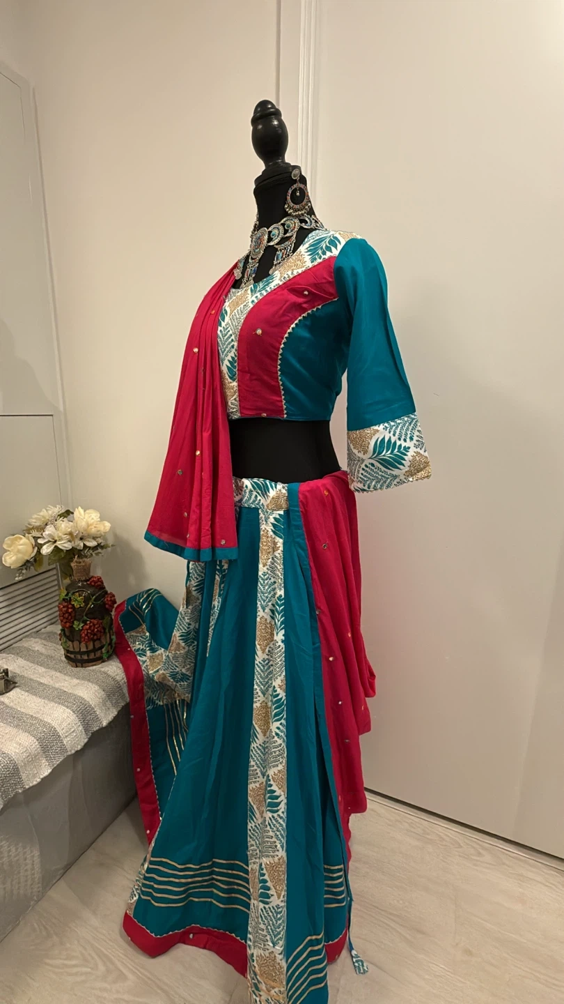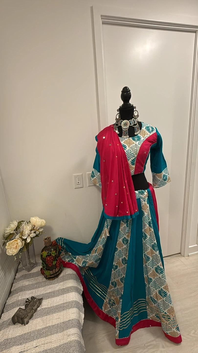 Beautiful designer and unique chaniya choli for 2025 Navratri for you to stand out. Extremely light to carry. Wide flare to twirl with your sakhis. Follow tyoharthreads.co on instagram for more