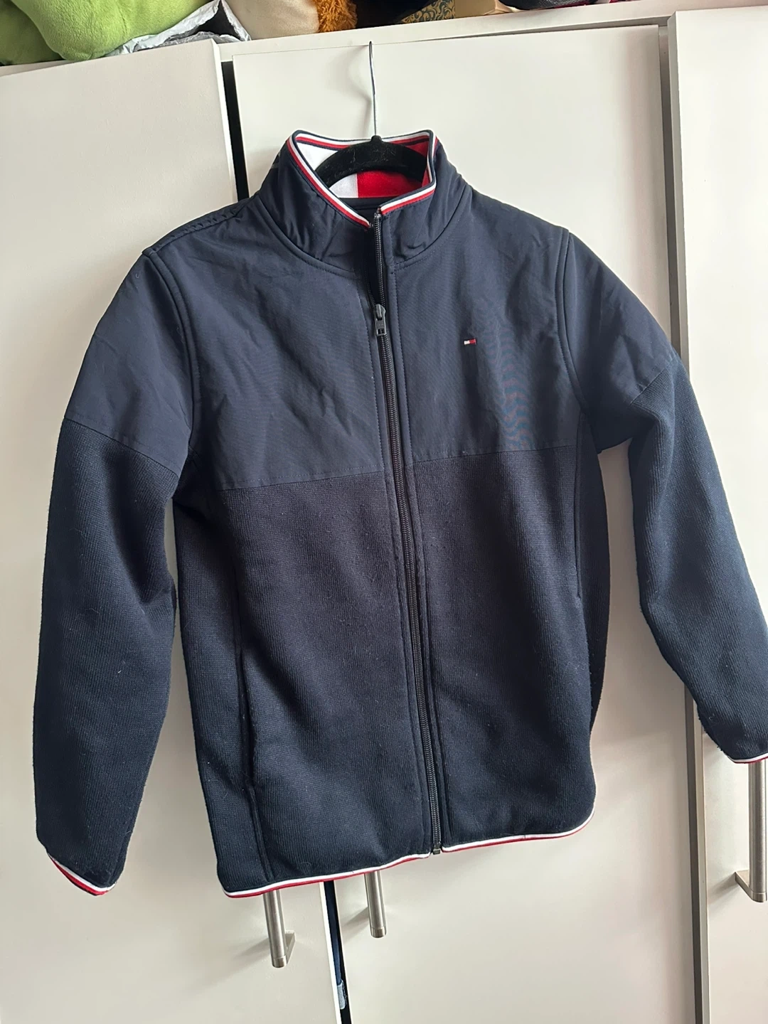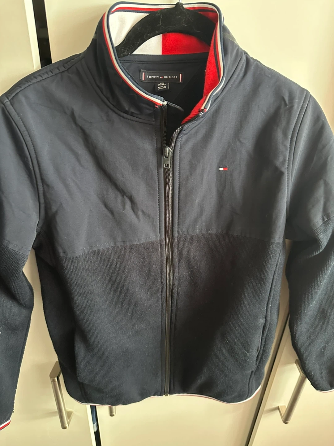 Tommy Hilfiger jacket in great condition! It's a size Large (12-14). The jacket is a navy blue colour with red and white detailing around the collar and cuffs. Please pay by cash