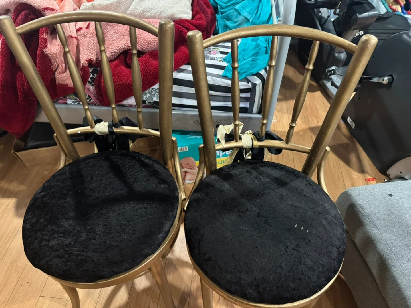 Selling a 4 gold-painted chairs featuring elegant black cushions. These chairs would be a stylish addition to any dining room or living space. They have a unique design with curved backs and are accented with black and gold ribbons. Perfect for adding a touch of sophistication to your home!