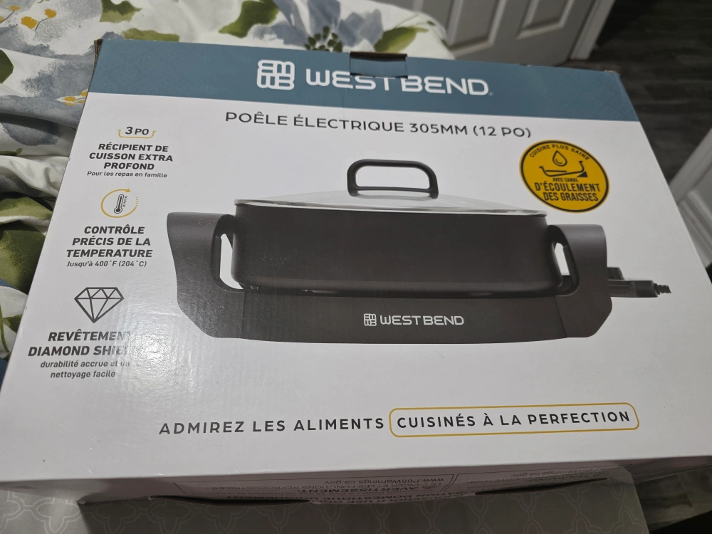 Selling a brand new West Bend electric skillet, still in its original packaging! This 305mm (12 inch) skillet features a deep cooking pot, perfect for family meals. It also has precise temperature control up to 400°F (204°C), and a diamond shield coating for increased durability and easy cleaning. Enjoy healthier cooking with its fat draining channel!