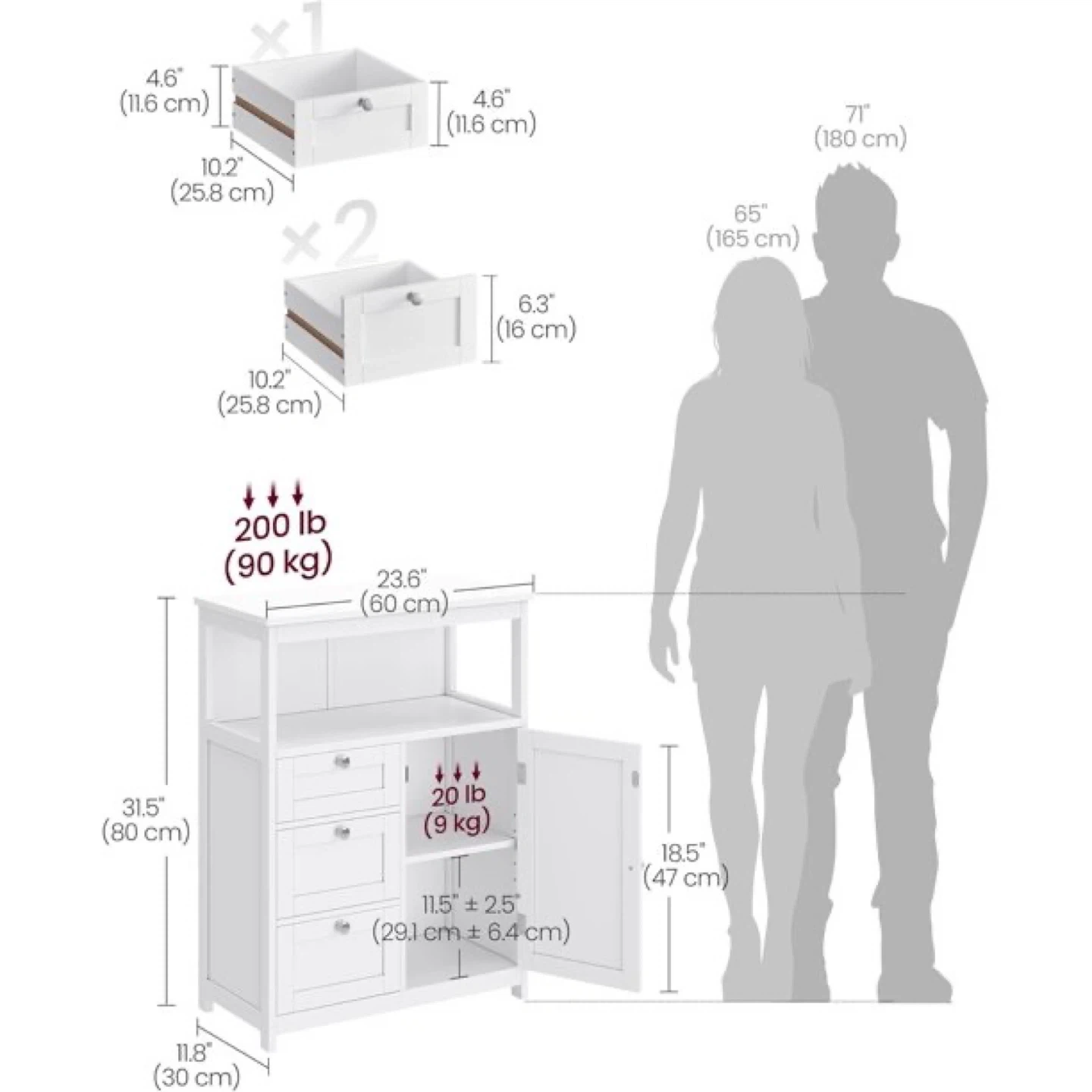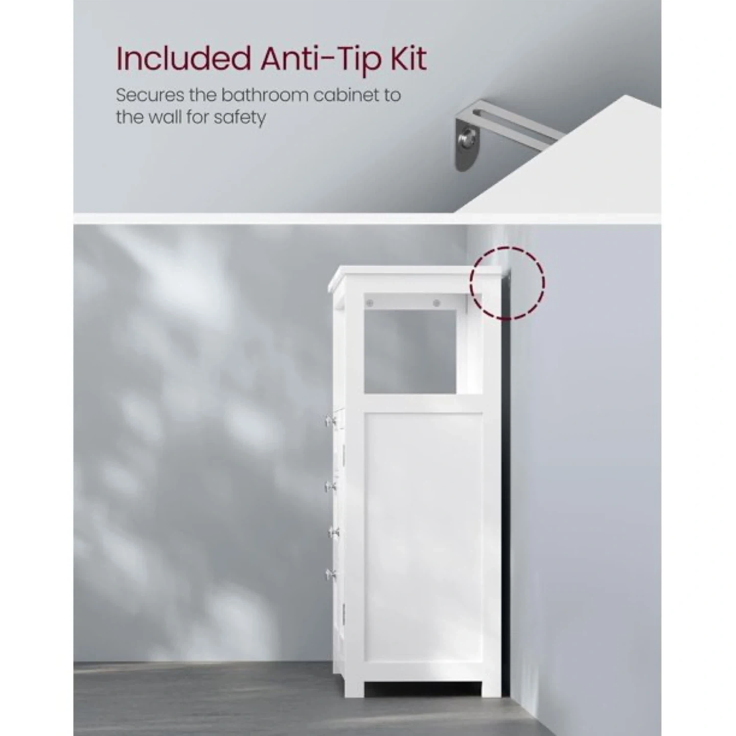 Keep your bathroom tidy and organized with this white floor cabinet! It features sectioned storage for often-used items, small items, and large items. The cabinet also includes an anti-tip kit to secure it to the wall for safety. Each drawer comes with a plastic stopper to prevent it from falling out during use