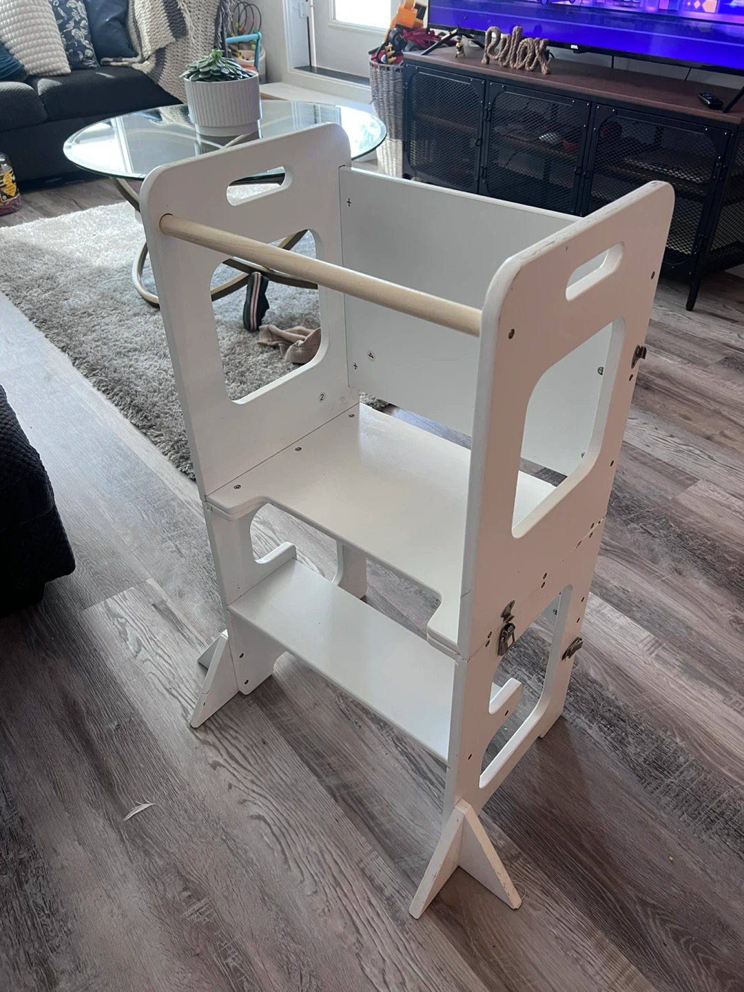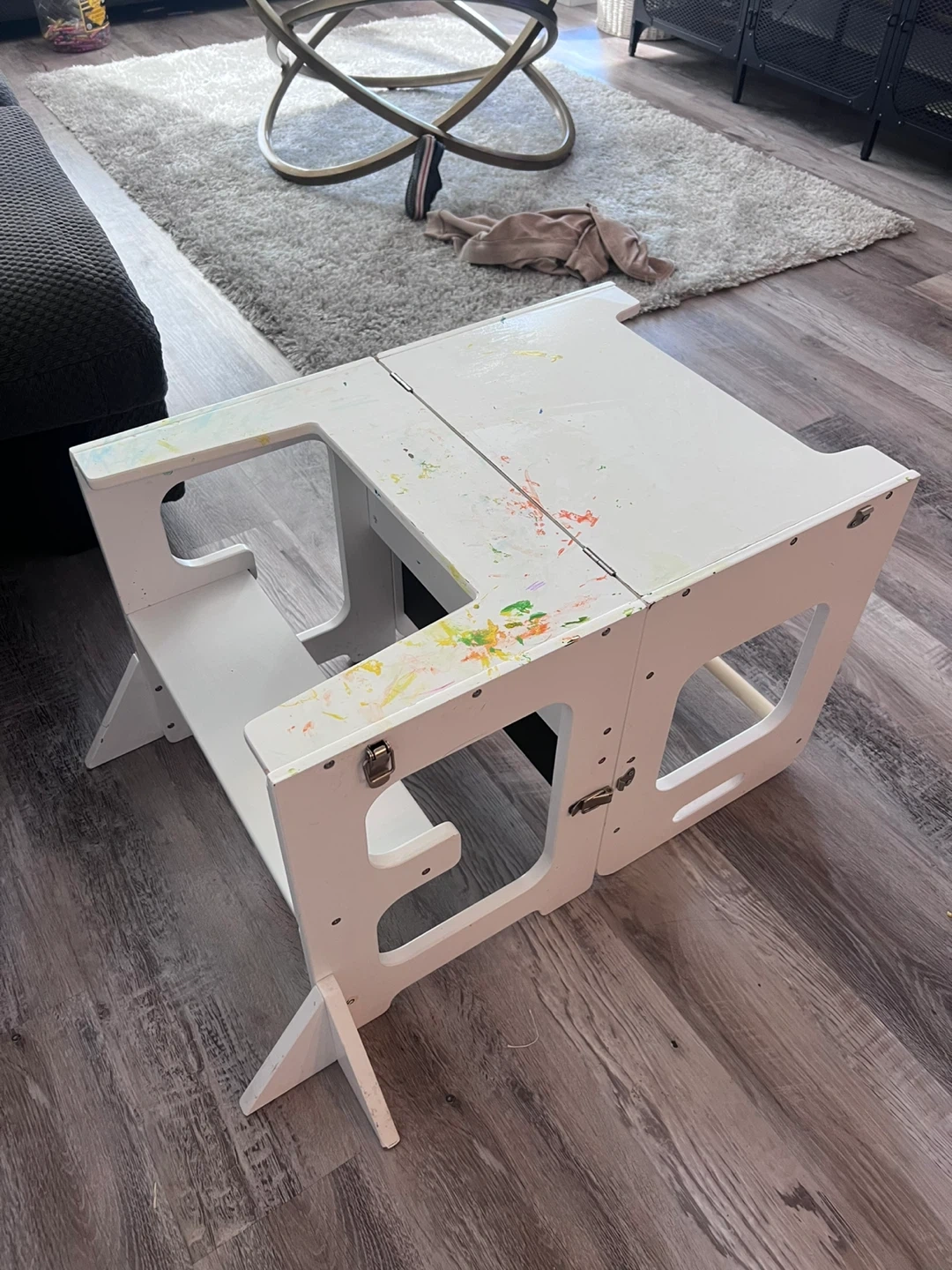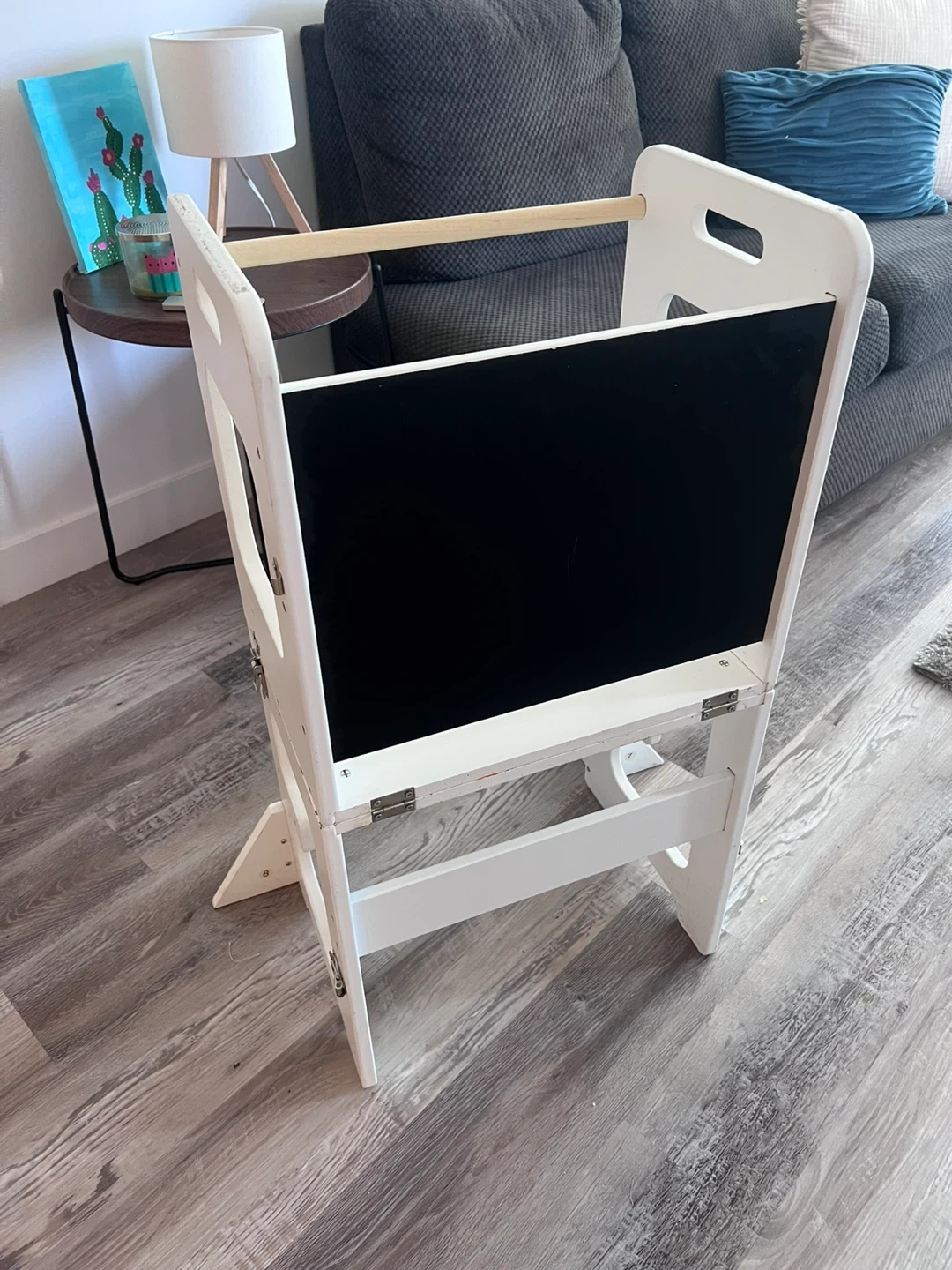Selling a learning tower in great condition! It's perfect for getting your little one involved in kitchen activities or any other tasks where they need a boost. It has a chalkboard on one side and some minor paint stains, but it's still fully functional and ready for a new home