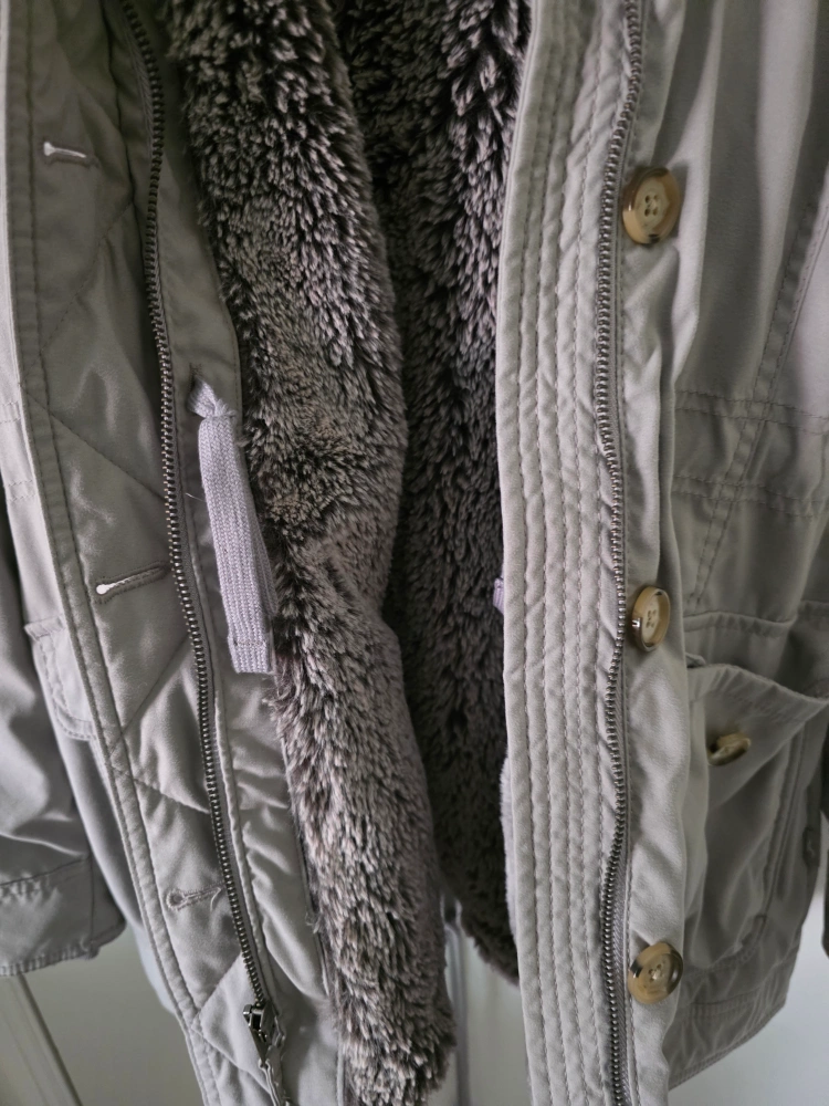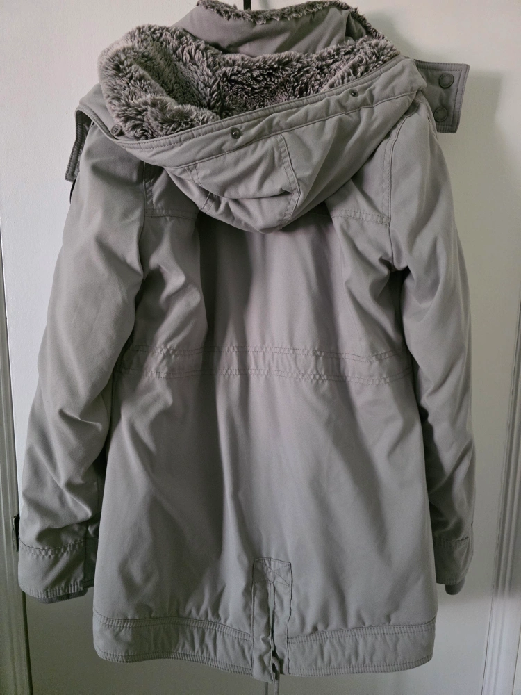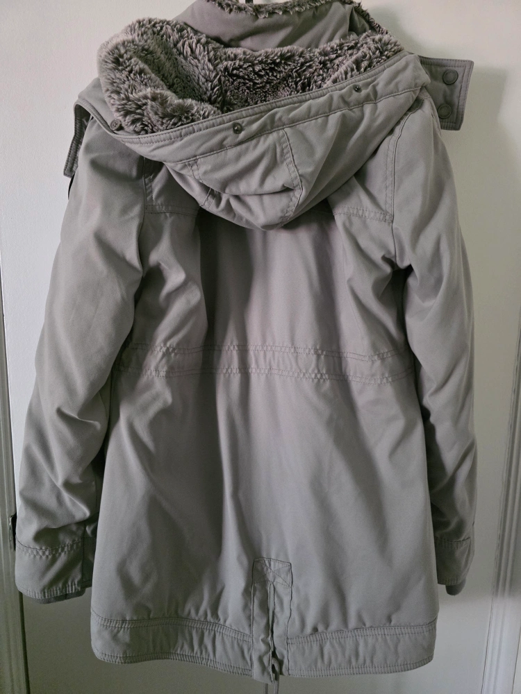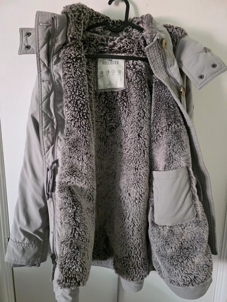 Selling a Hollister parka in a lovely grey colour! It's a size small and features a cozy fur lining to keep you warm during those chilly days. Perfect for staying stylish and comfortable!