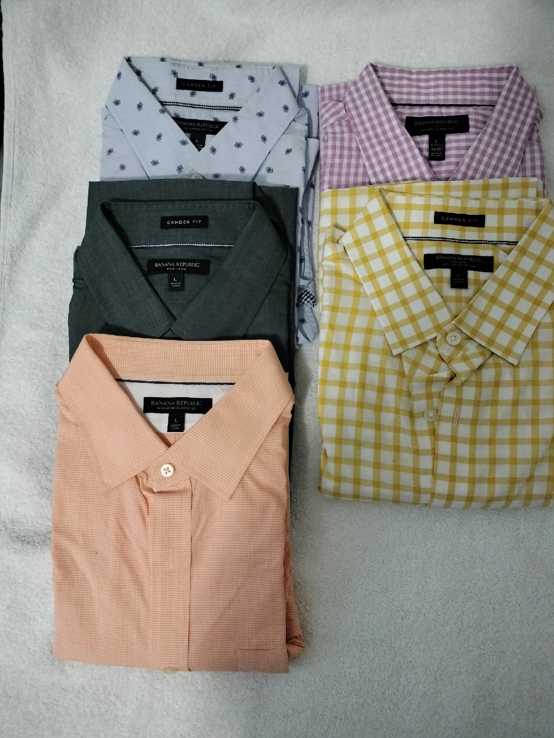 Selling a set of 5 Banana Republic Camden Fit shirts, size Large for $10. They appear to be in good condition and include a variety of colors and patterns. Great for work or casual wear!