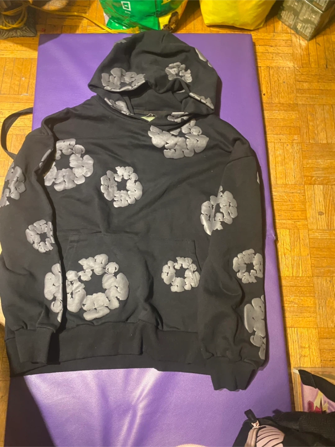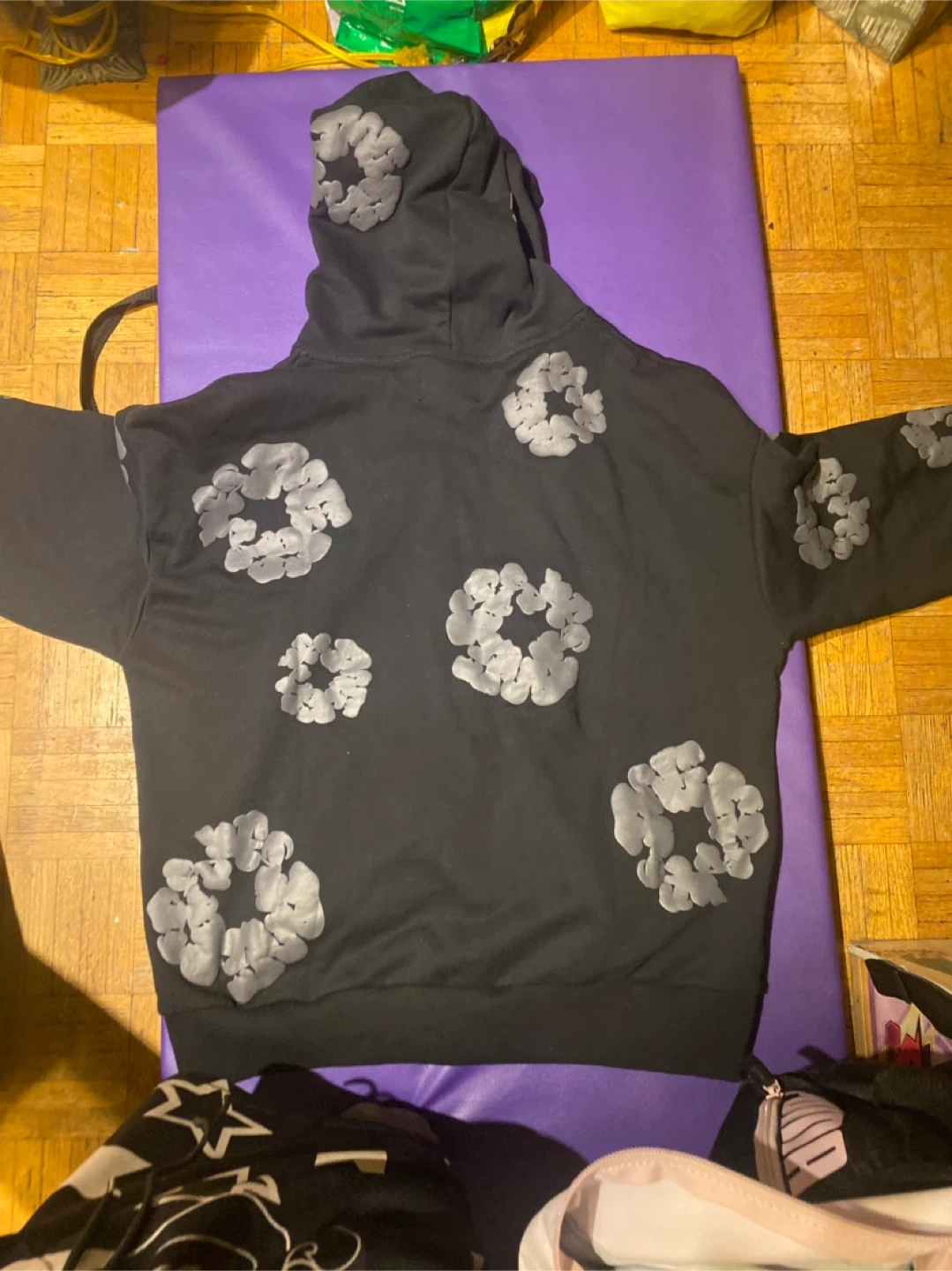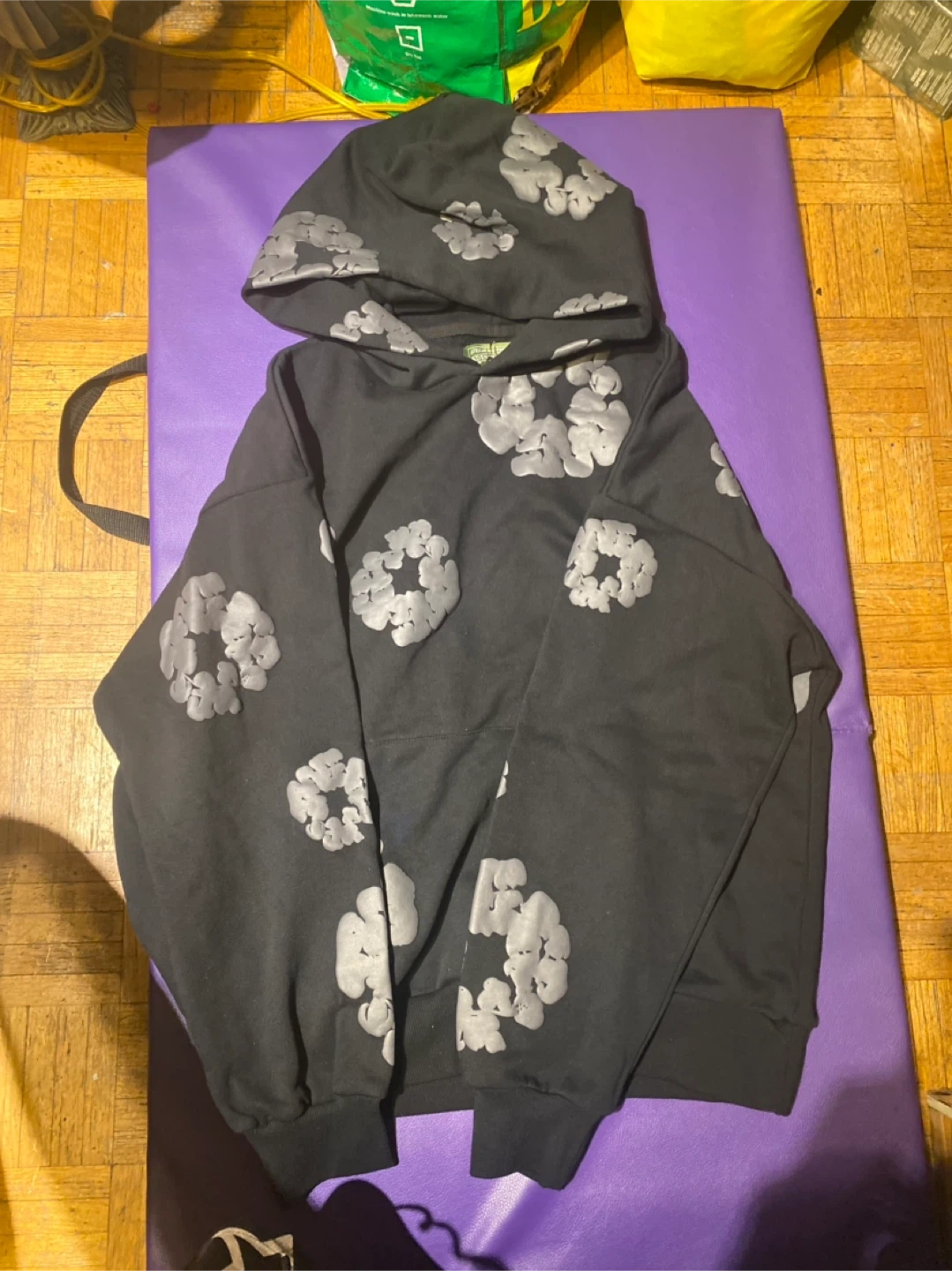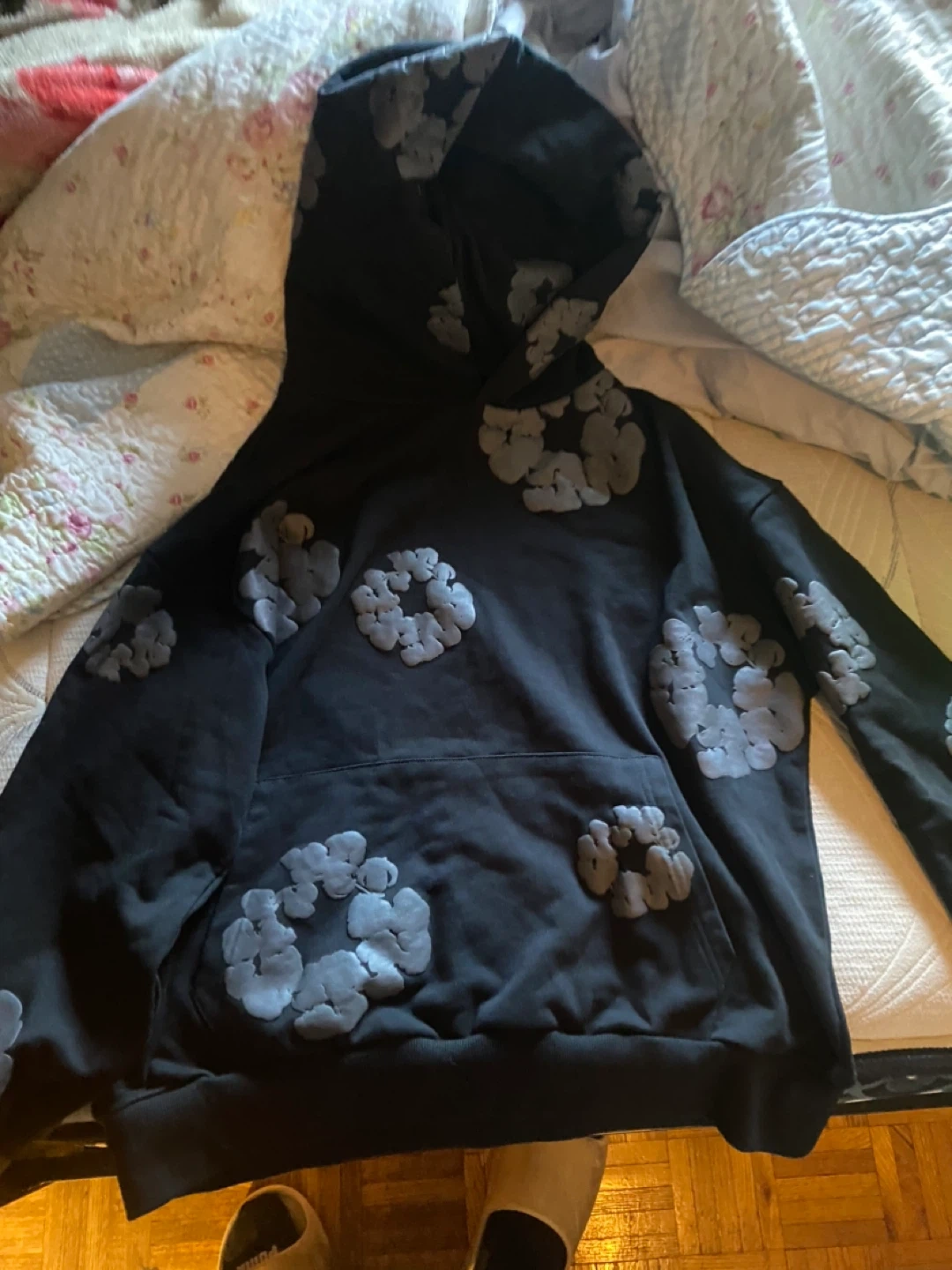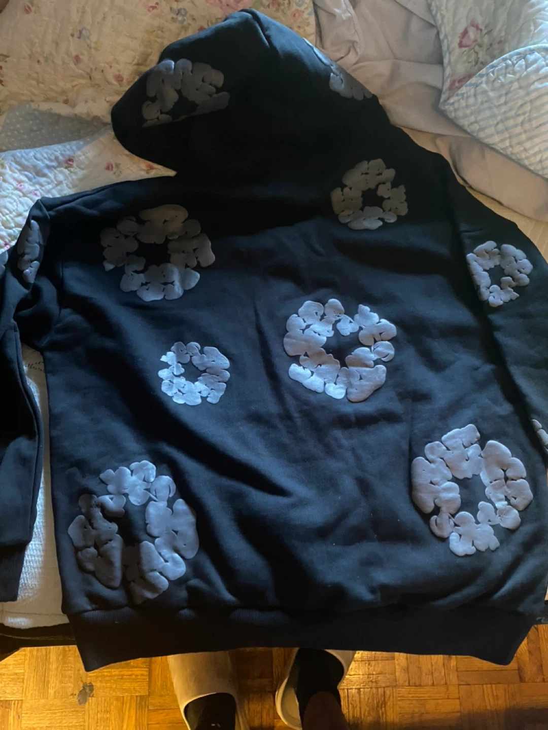 Selling a Denim Tears hoodie in size medium. The hoodie is black with a floral design. It's in great condition, and ready for a new home!