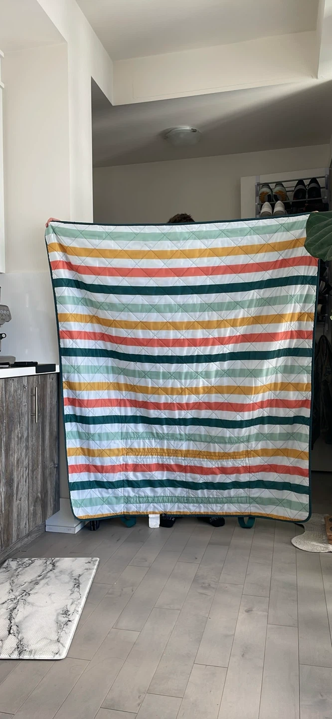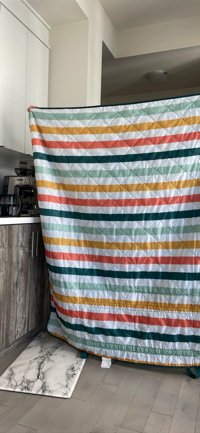 This is a picnic blanket with a striped pattern and handles for easy carrying! It's perfect for outdoor gatherings, picnics, or even just lounging in the backyard. The blanket is in great condition and ready for a new home
