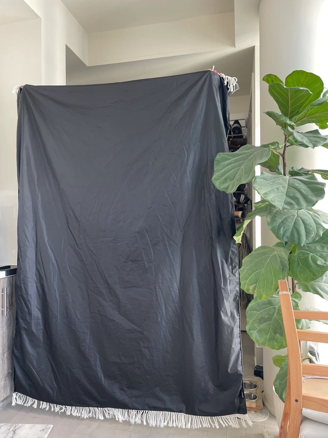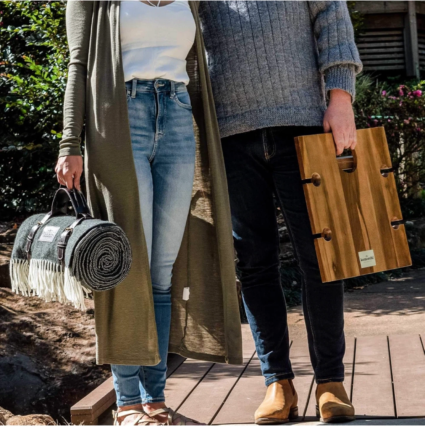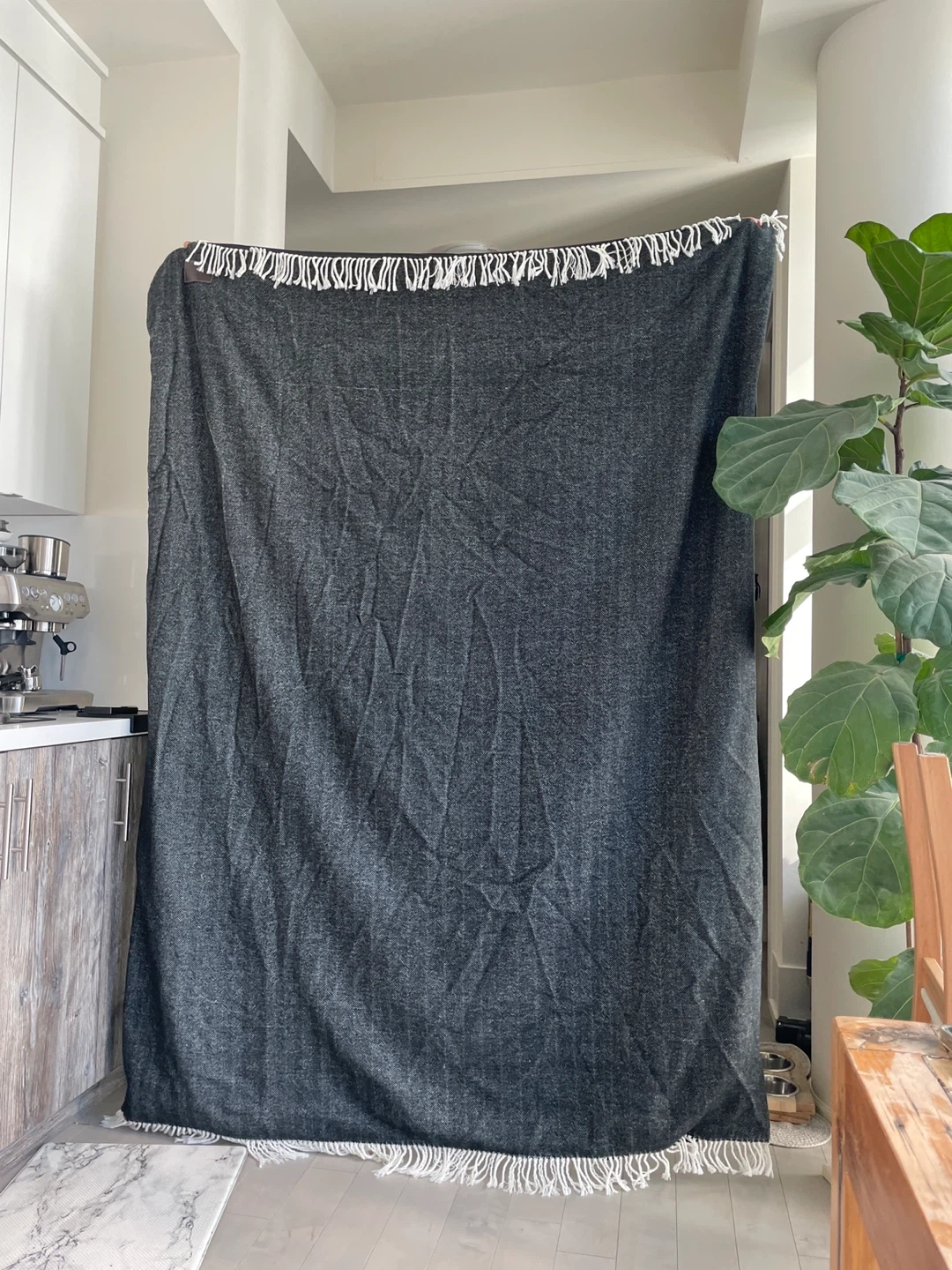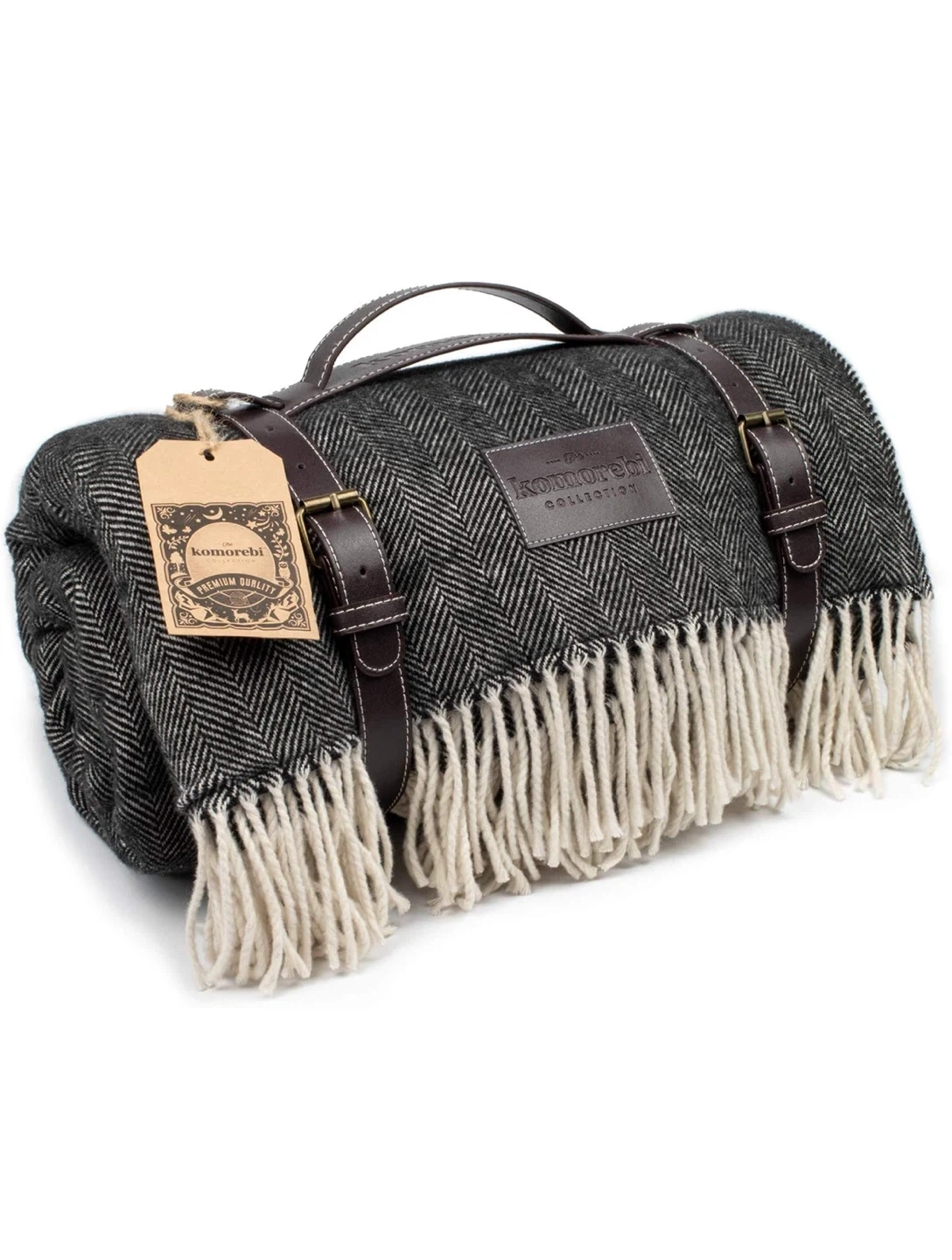 Cozy herringbone picnic blanket by Komorebi! It's perfect for outdoor adventures or cozying up at home. The blanket features a stylish design with fringe detailing. Great for picnics, camping, or just relaxing in the park. It's in great condition and ready for a new home