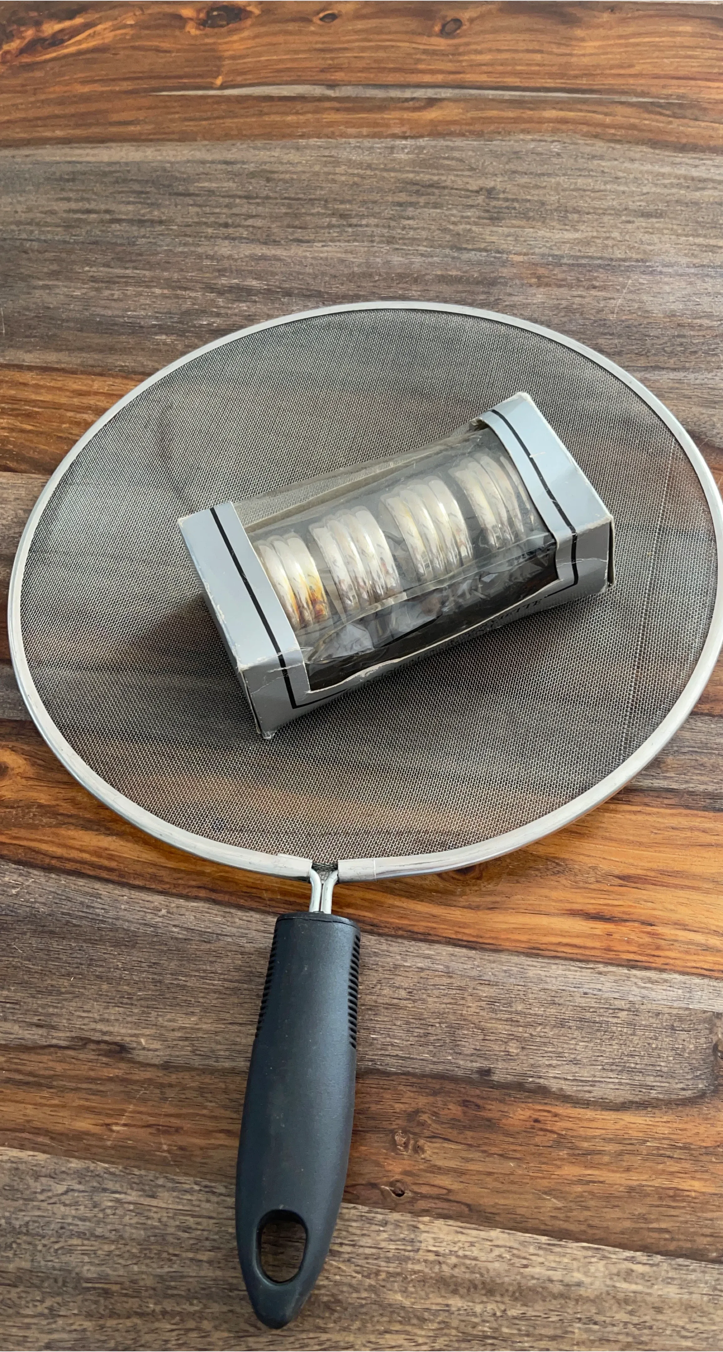 I have a new splatter screen with a set of napkin rings still in their original packaging! The splatter screen has a black handle and is in perfect condition. The napkin rings are silver and come in a box of six. Great for keeping your kitchen clean and adding a touch of elegance to your table setting