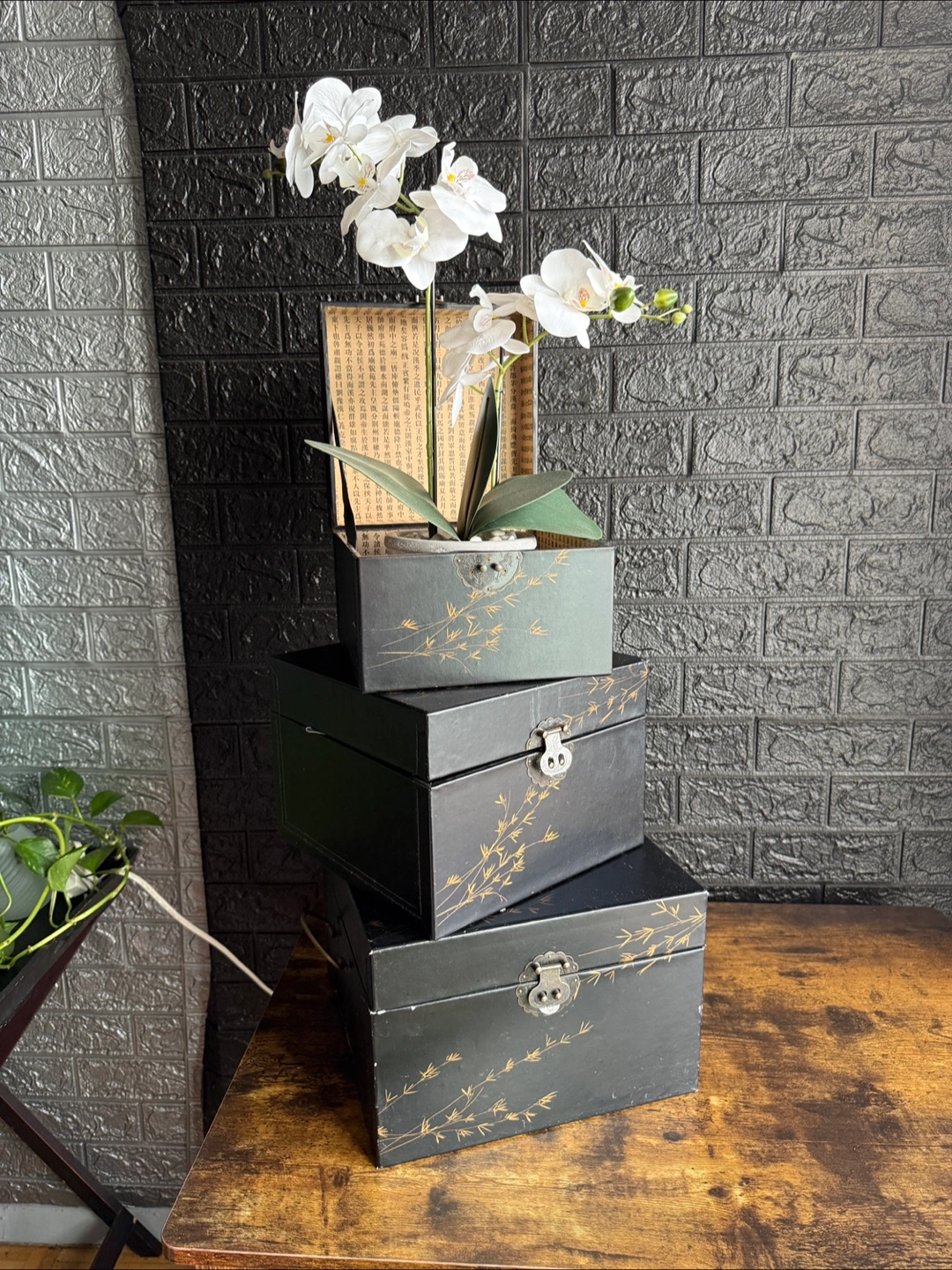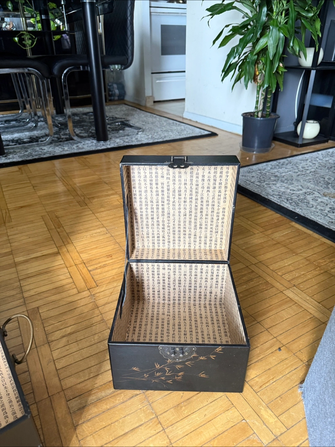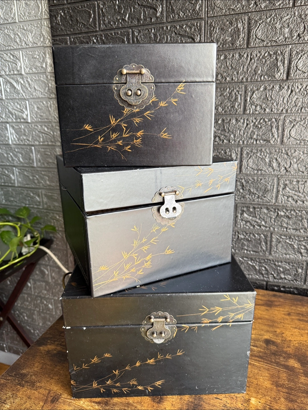 65$ f Set of three decorative wooden and metal lacquer decorative boxes in black with gold bamboo design. These boxes stack neatly and provide stylish storage for any room. Black metal finishings with metal llock design. Paper inside is pristine no scratches or rips. Looks like Japanese writing. These sturdy boxes are ready for their new home. We’ll sell separately or together These aren’t your regular IKEA cardboard boxes these are strong sturdy vintage boxes that will not fall apart on you and will last you a lifetime. Big box H 20cm W 30 L 30 35 cm squared. 28 Med box H 18cm W 25cm D 25cm. 25 Small H 16 cm W 20cm L 20cm 20