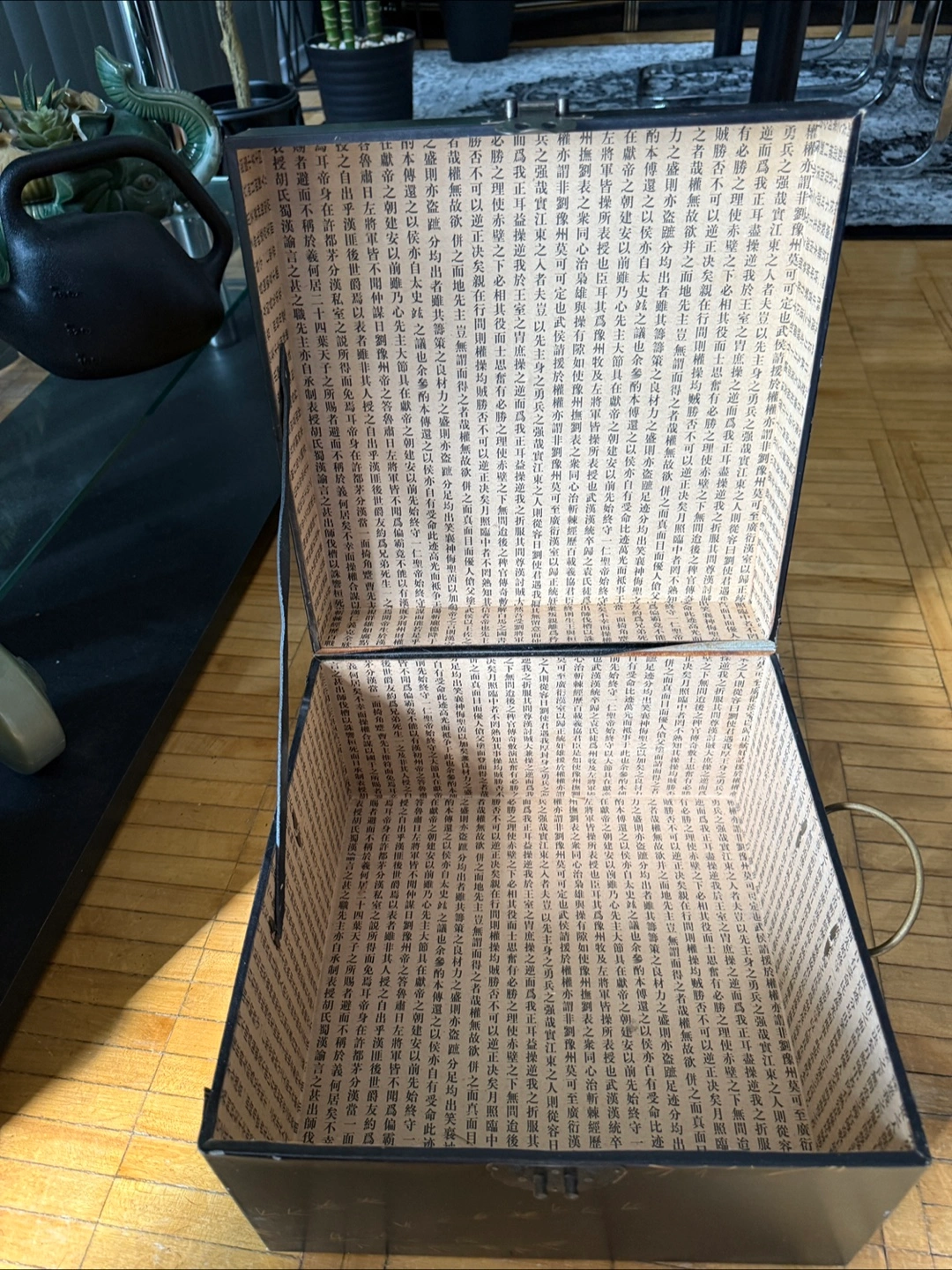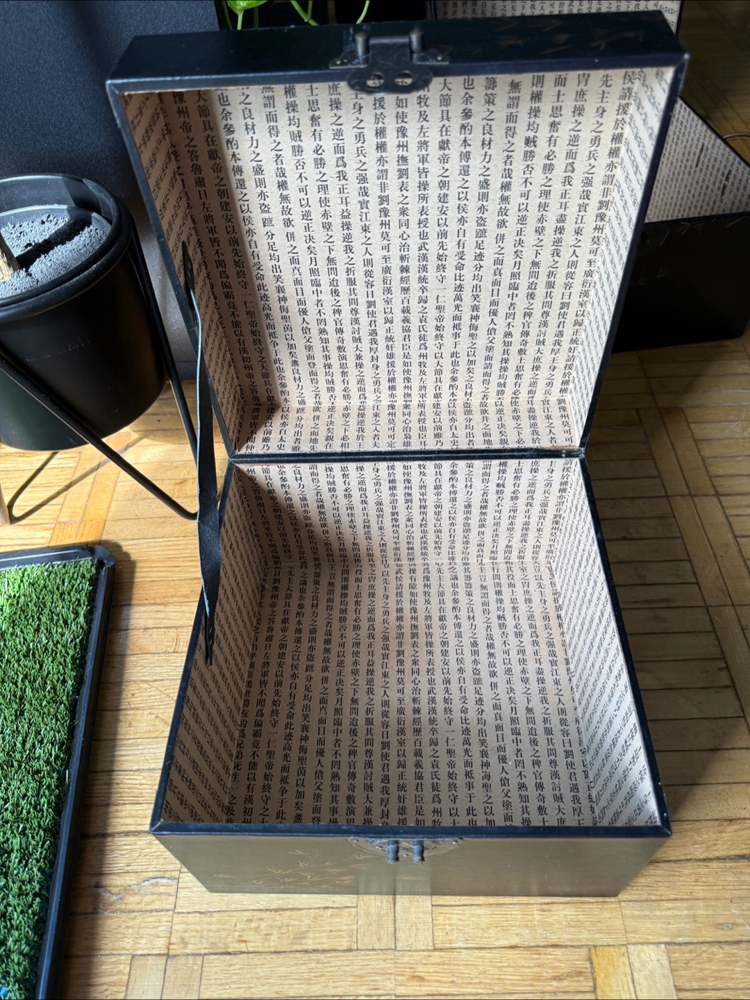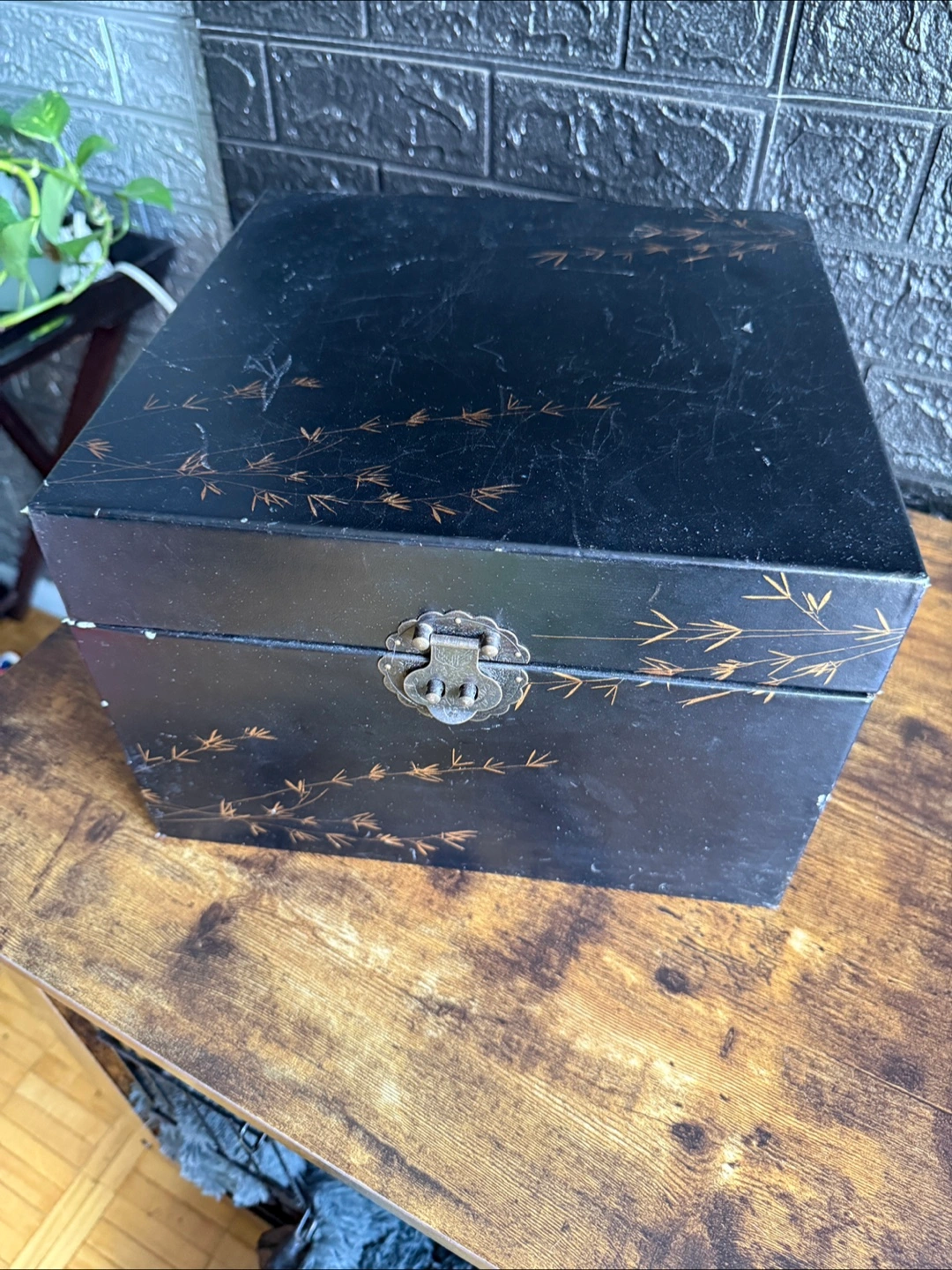 65$ f Set of three decorative wooden and metal lacquer decorative boxes in black with gold bamboo design. These boxes stack neatly and provide stylish storage for any room. Black metal finishings with metal llock design. Paper inside is pristine no scratches or rips. Looks like Japanese writing. These sturdy boxes are ready for their new home. We’ll sell separately or together These aren’t your regular IKEA cardboard boxes these are strong sturdy vintage boxes that will not fall apart on you and will last you a lifetime. Big box H 20cm W 30 L 30 35 cm squared. 28 Med box H 18cm W 25cm D 25cm. 25 Small H 16 cm W 20cm L 20cm 20