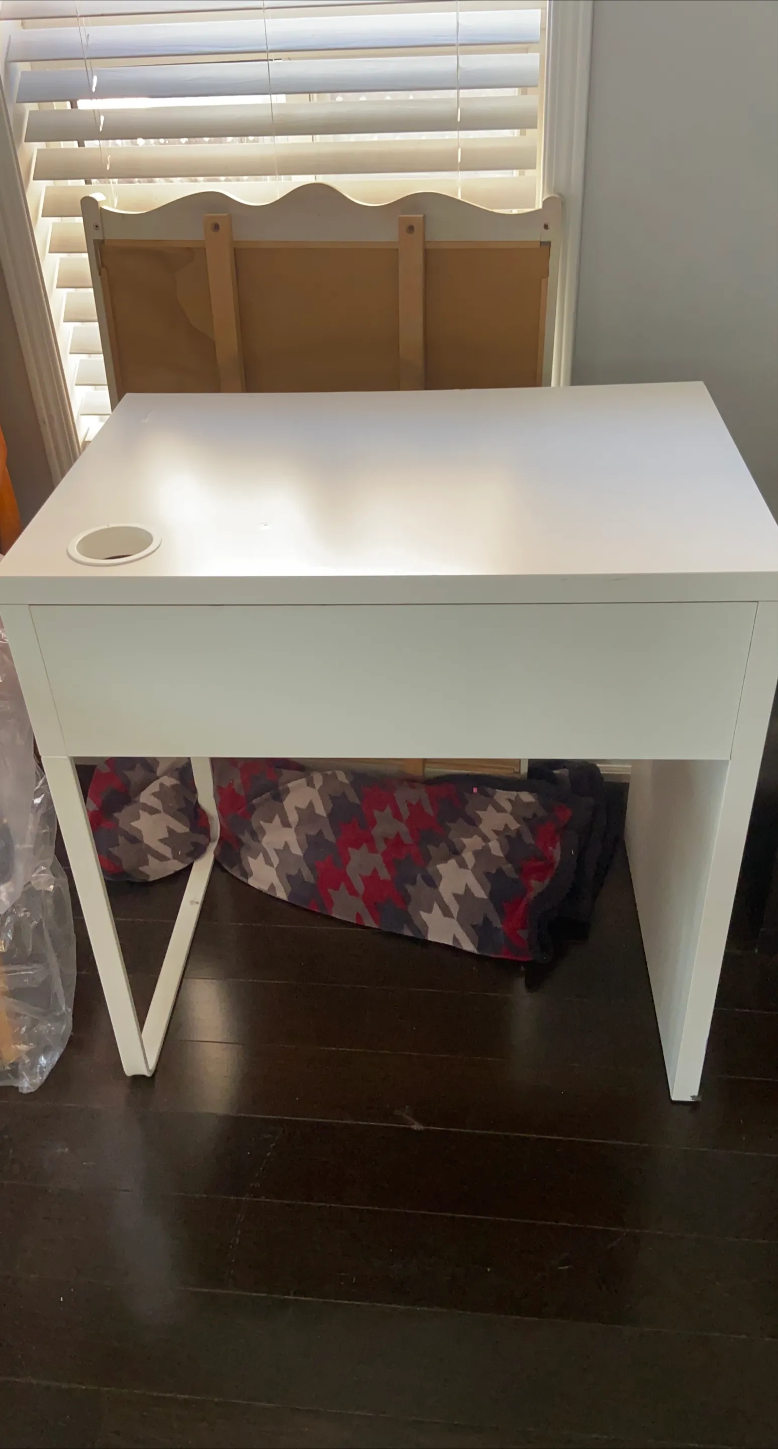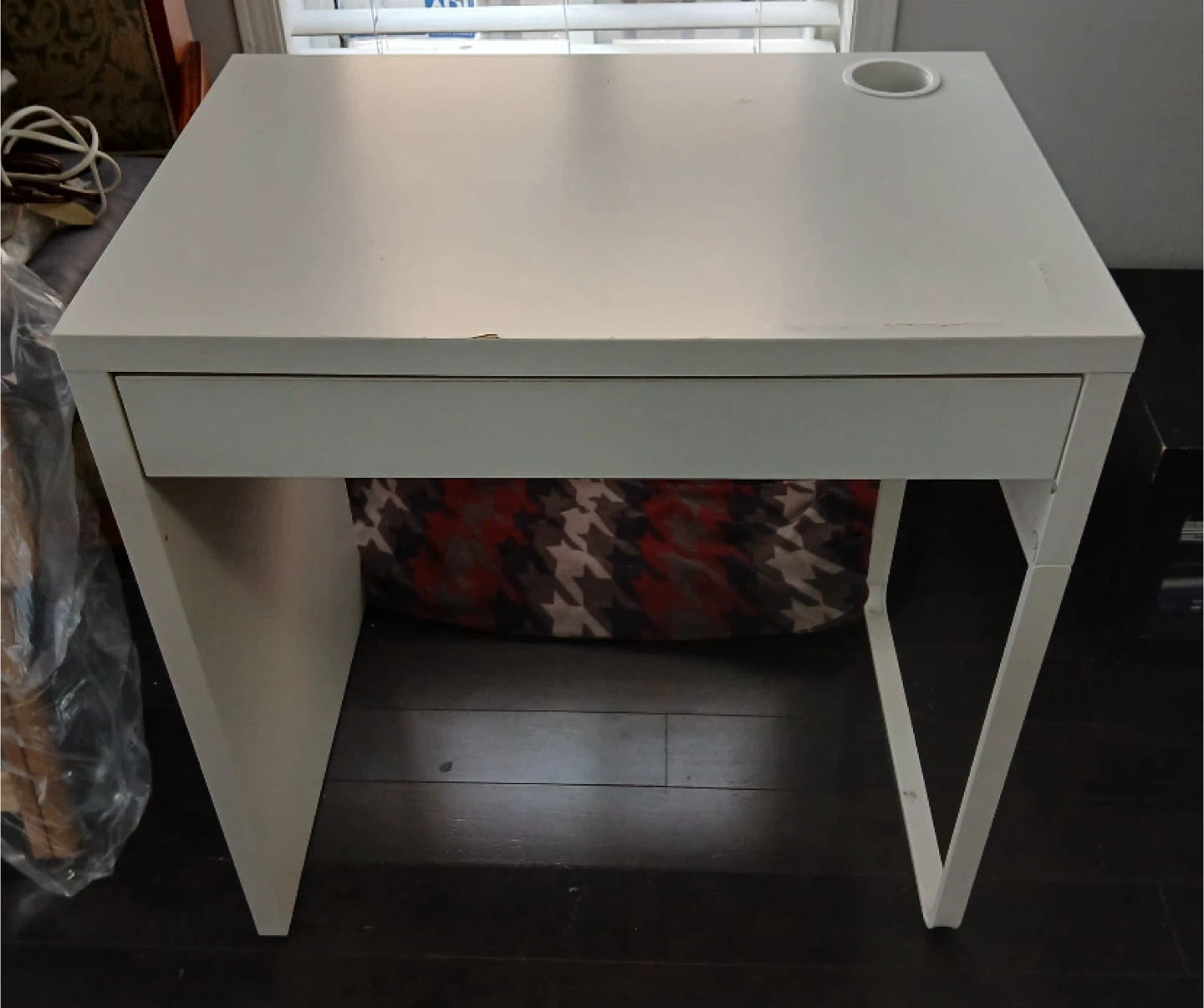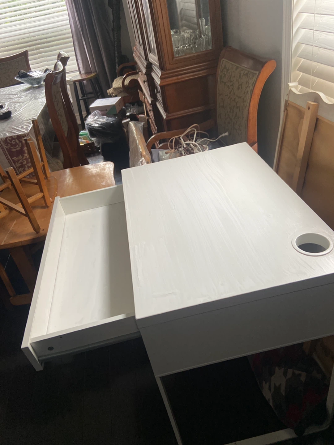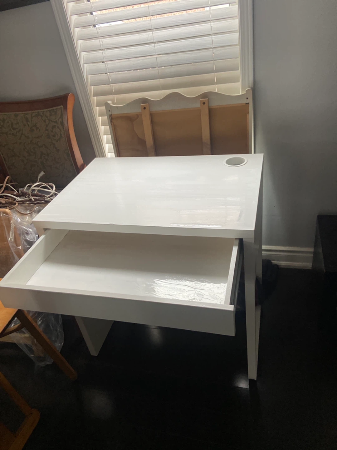 clean white desk! It has a convenient cable hole to keep your workspace tidy. The desk is in good condition and mirror