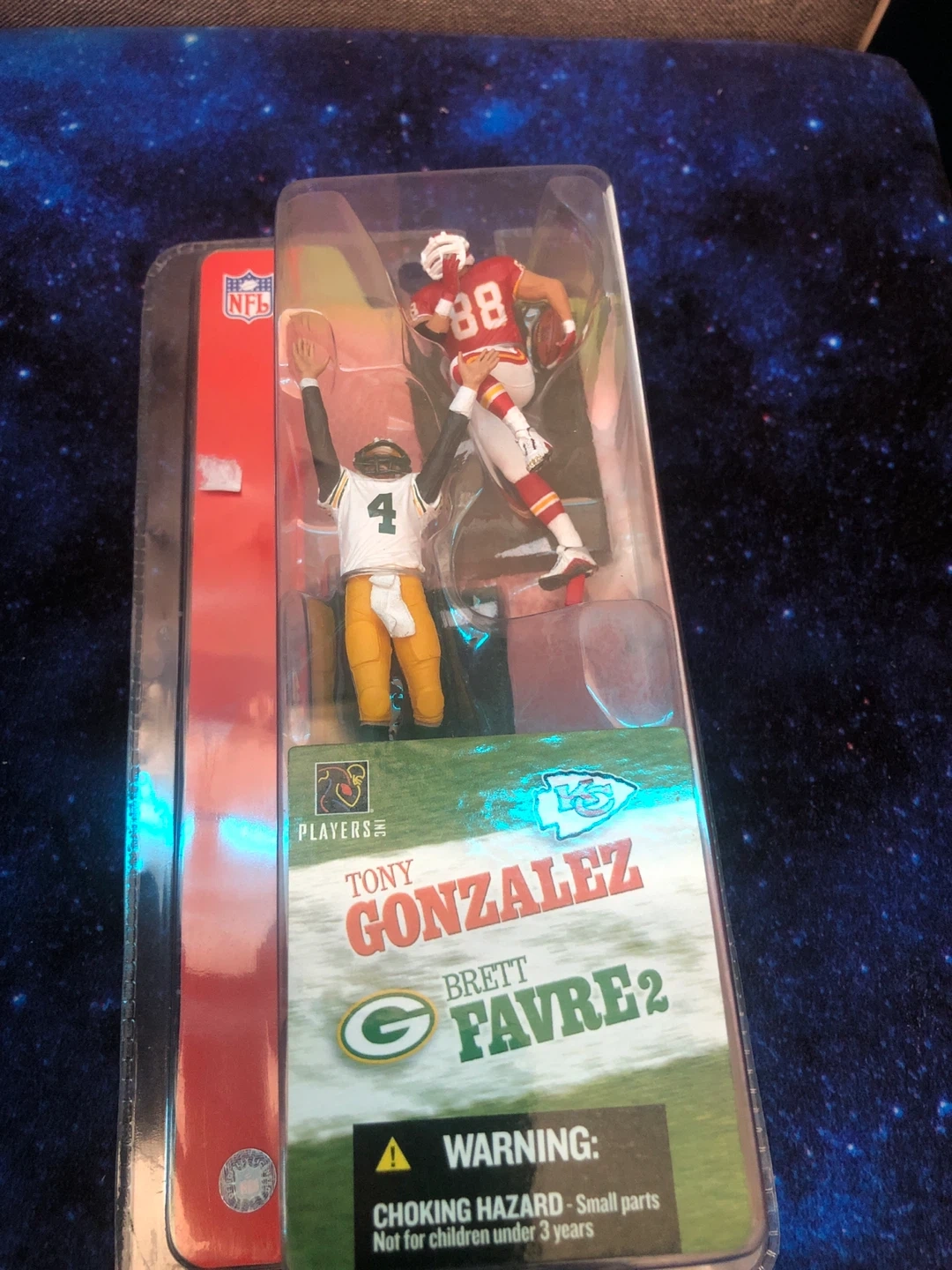 10Selling a set of NFL figures featuring Tony Gonzalez and Brett Favre. These are from the Players Inc. series and are still in their original packaging. Perfect for any football fan or collector!