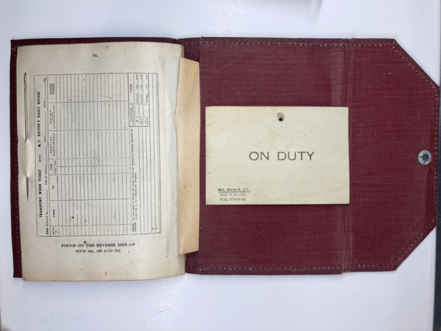 As these were being prepared for pictures it was discovered that not only is there still a needle stuck through some of the last pages in one license (very practical and resourceful of this soldier!) there was also an “On Duty” badge hidden in the back page pocket! These will be included to keep this all together.