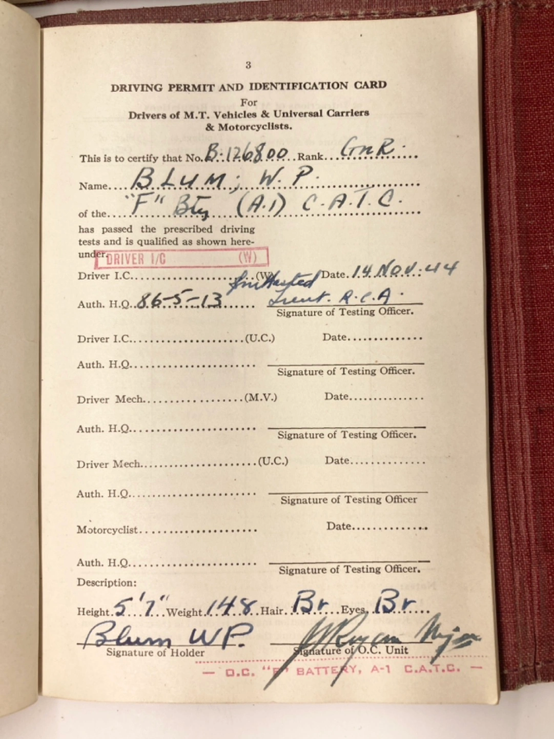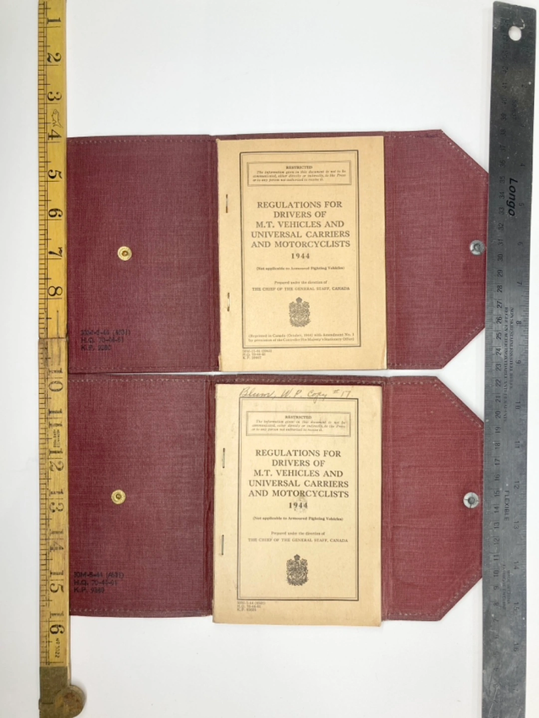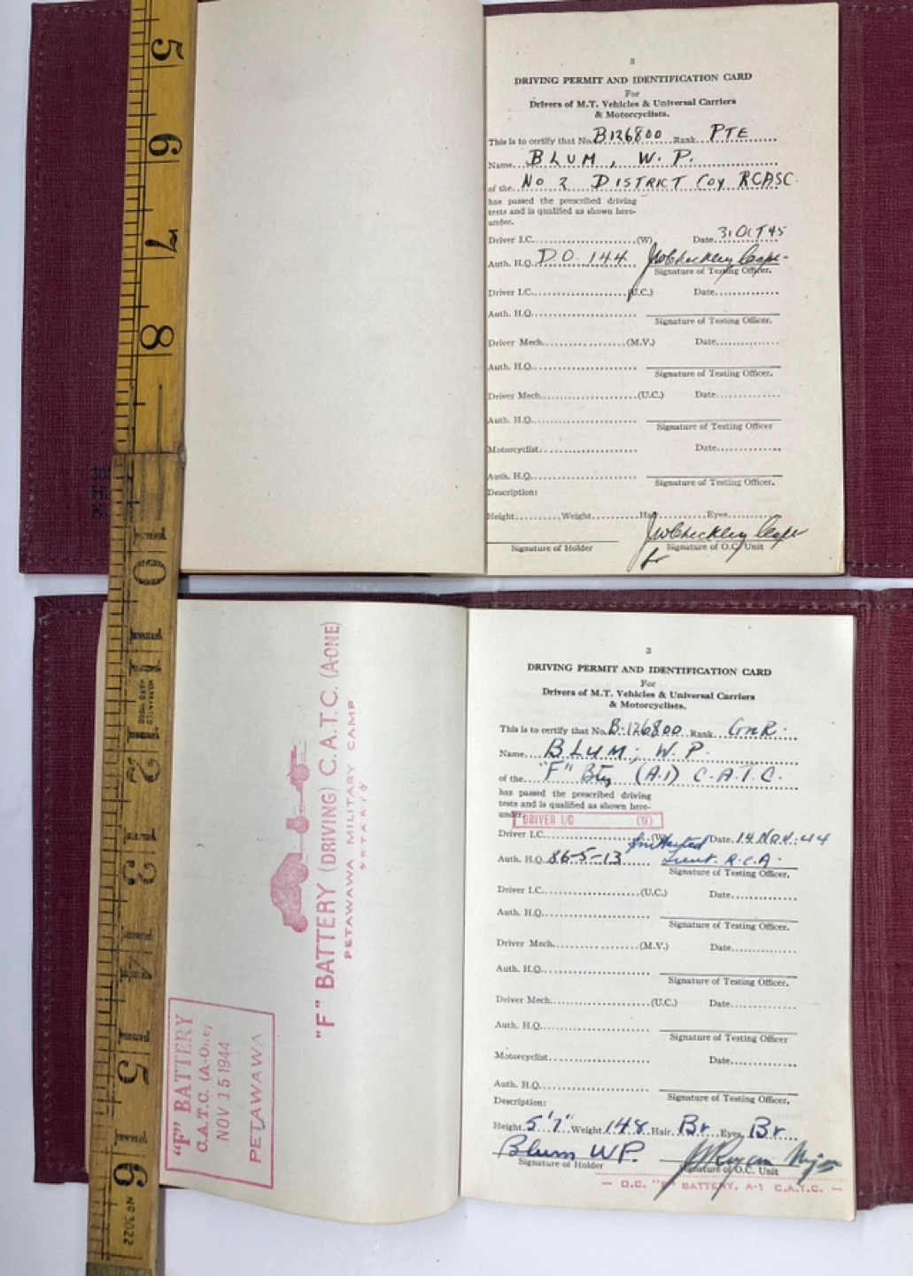 This is a pair of Canadian military driver’s licenses from the Great War. Both were issued to the same soldier - Gunner WP Blum in 1944 and 1945 from Petawawa Military Camp in Ontario, Canada.
