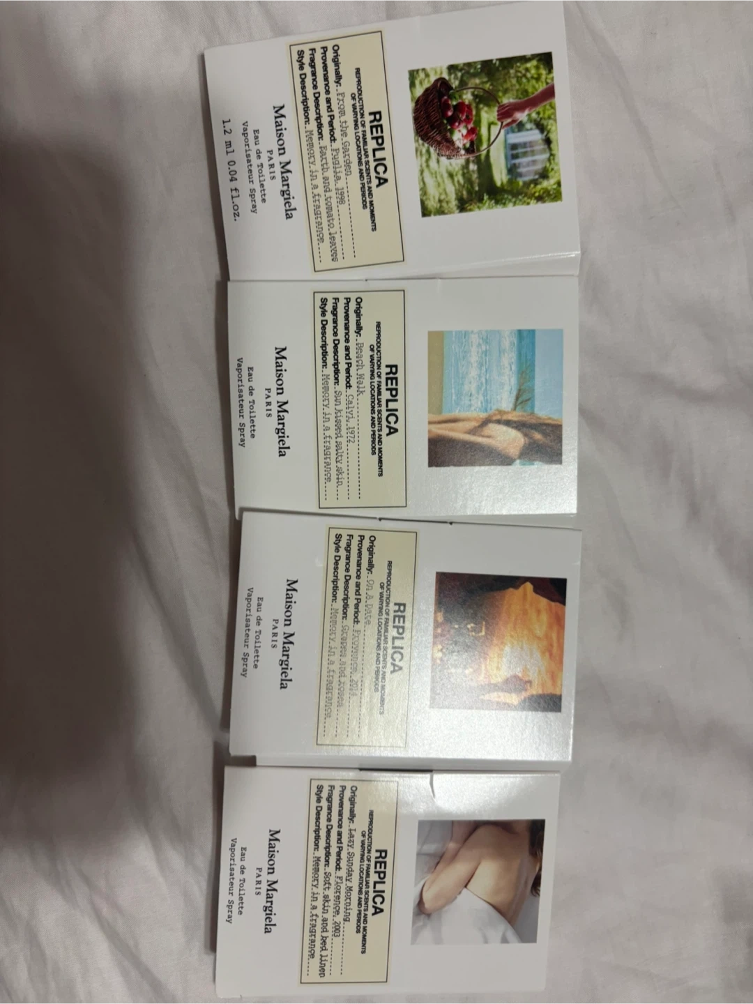Selling a set of Maison Margiela Replica mini perfumes! Includes four different scents: - From the Garden (Puglia, 1998): Earth and tomato leaves - Beach Walk (Calvi, 1972): Sun kissed salty skin - On A Date (Provence, 2014): Grapes and rose - Lazy Sunday Morning (Florence, 2003): Soft skin and bed linen Each bottle contains 1.2ml (0.04 fl.oz.)