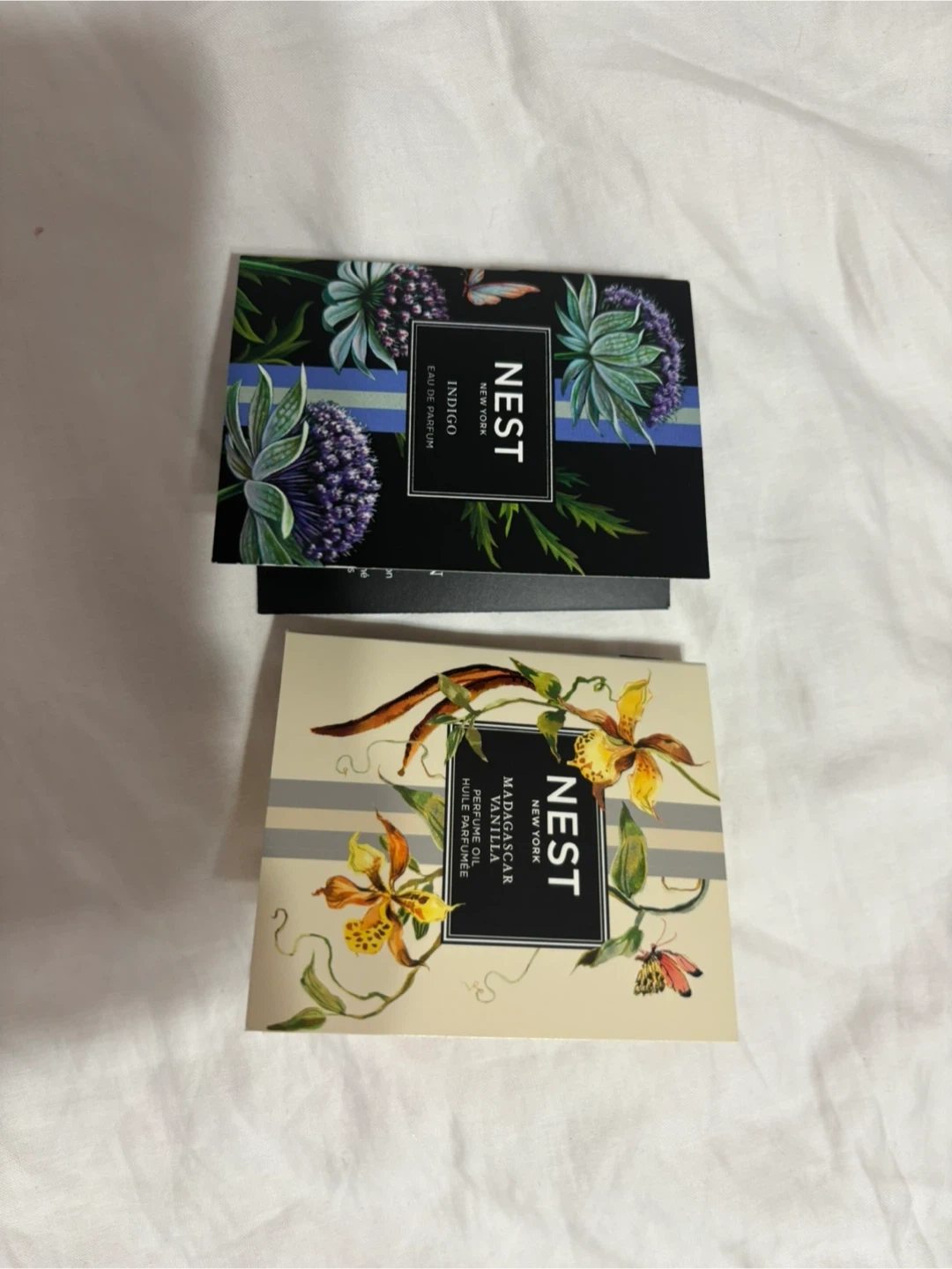 Selling two perfume samples from NEST New York: Indigo Eau de Parfum and Madagascar Vanilla Perfume Oil! Perfect for trying out these scents before committing to a full bottle