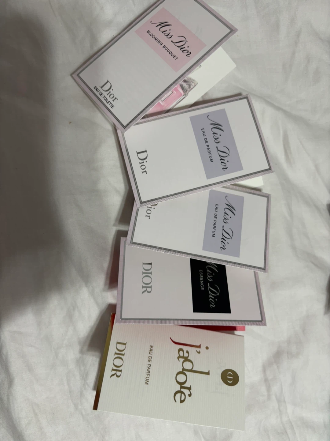 Selling a collection of Dior perfume samples! Includes Miss Dior Blooming Bouquet (Eau de Toilette), Miss Dior Eau de Parfum, Miss Dior Essence, and J'adore Eau de Parfum