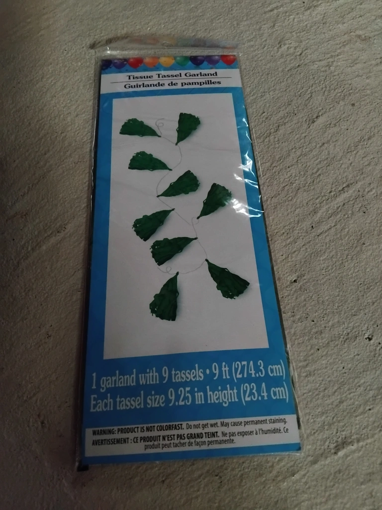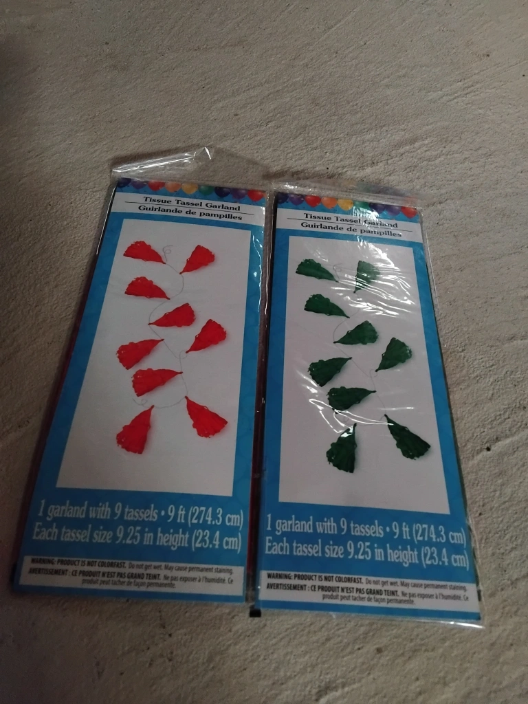 I have two tissue tassel garlands for sale. One is red and the other is green. Each garland has 9 tassels and is 9 ft (274.3 cm) long. Each tassel is 9.25 inches (23.4 cm) in height