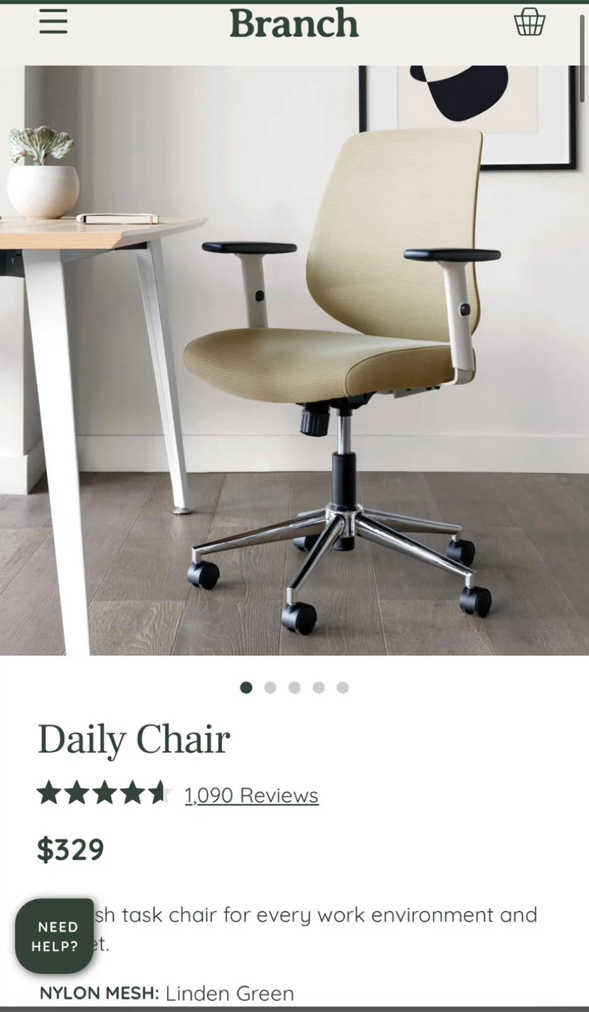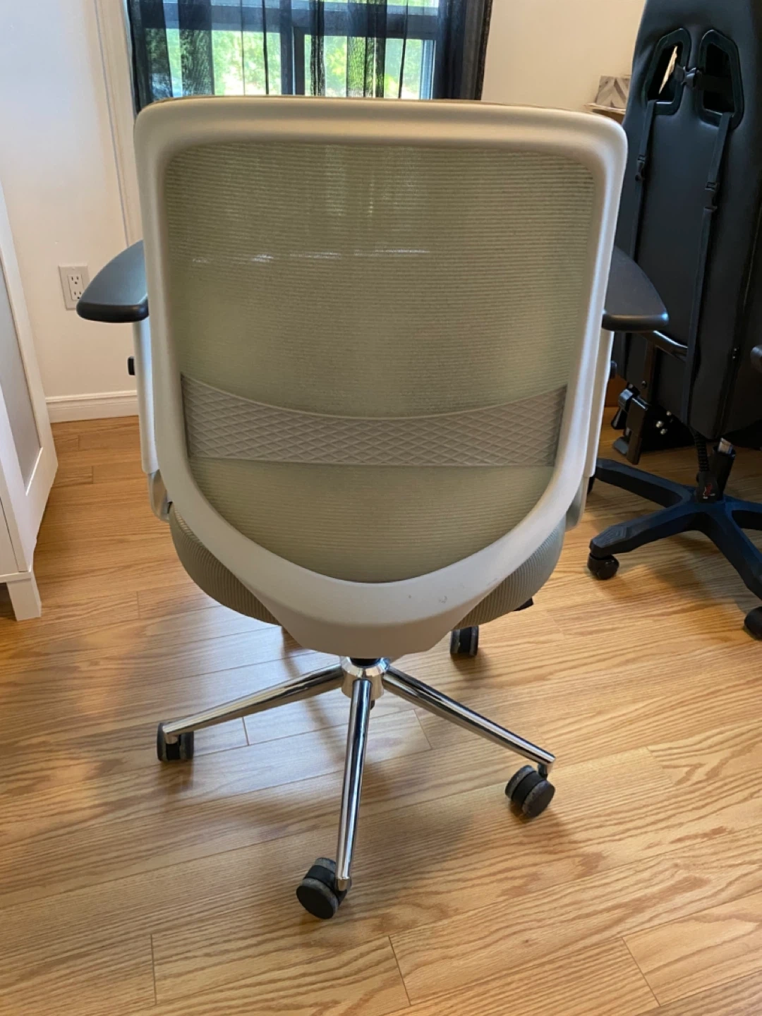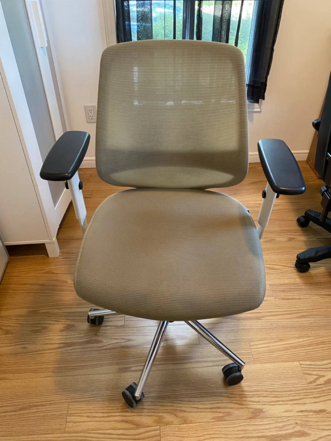 Looking to sell this beige office chair. It's in good condition with minor stains. The chair features a comfortable mesh back and padded seat, perfect for long workdays. The armrests are black and has a five-wheel base. Original price $329!