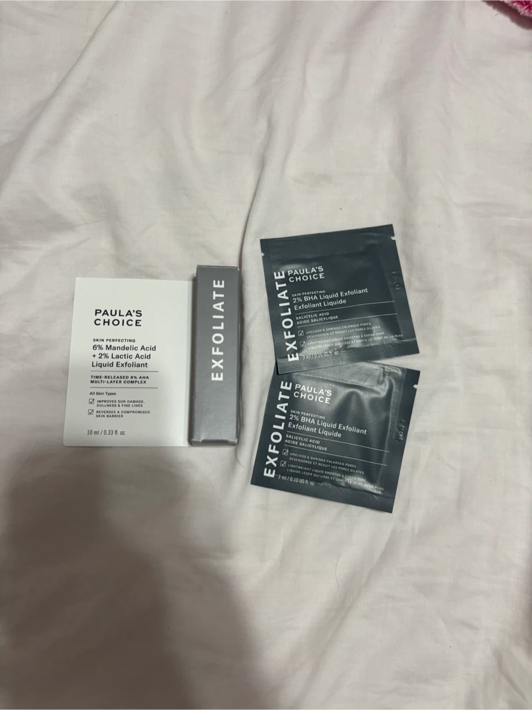 Selling a set of Paula's Choice exfoliants! This includes: - Skin Perfecting 6% Mandelic Acid + 2% Lactic Acid Liquid Exfoliant (10 ml / 0.33 fl. oz) - 2% BHA Liquid Exfoliant samples (3 ml / 0.10 US fl. oz each) Perfect for trying out different exfoliants to see what works best for your skin