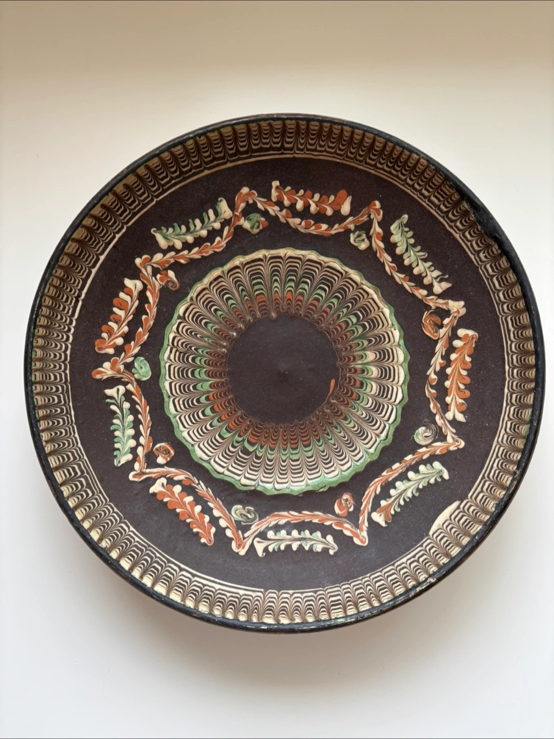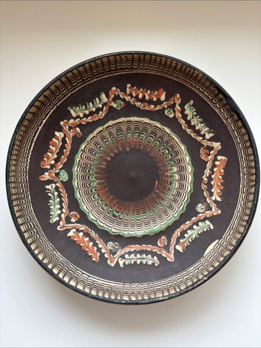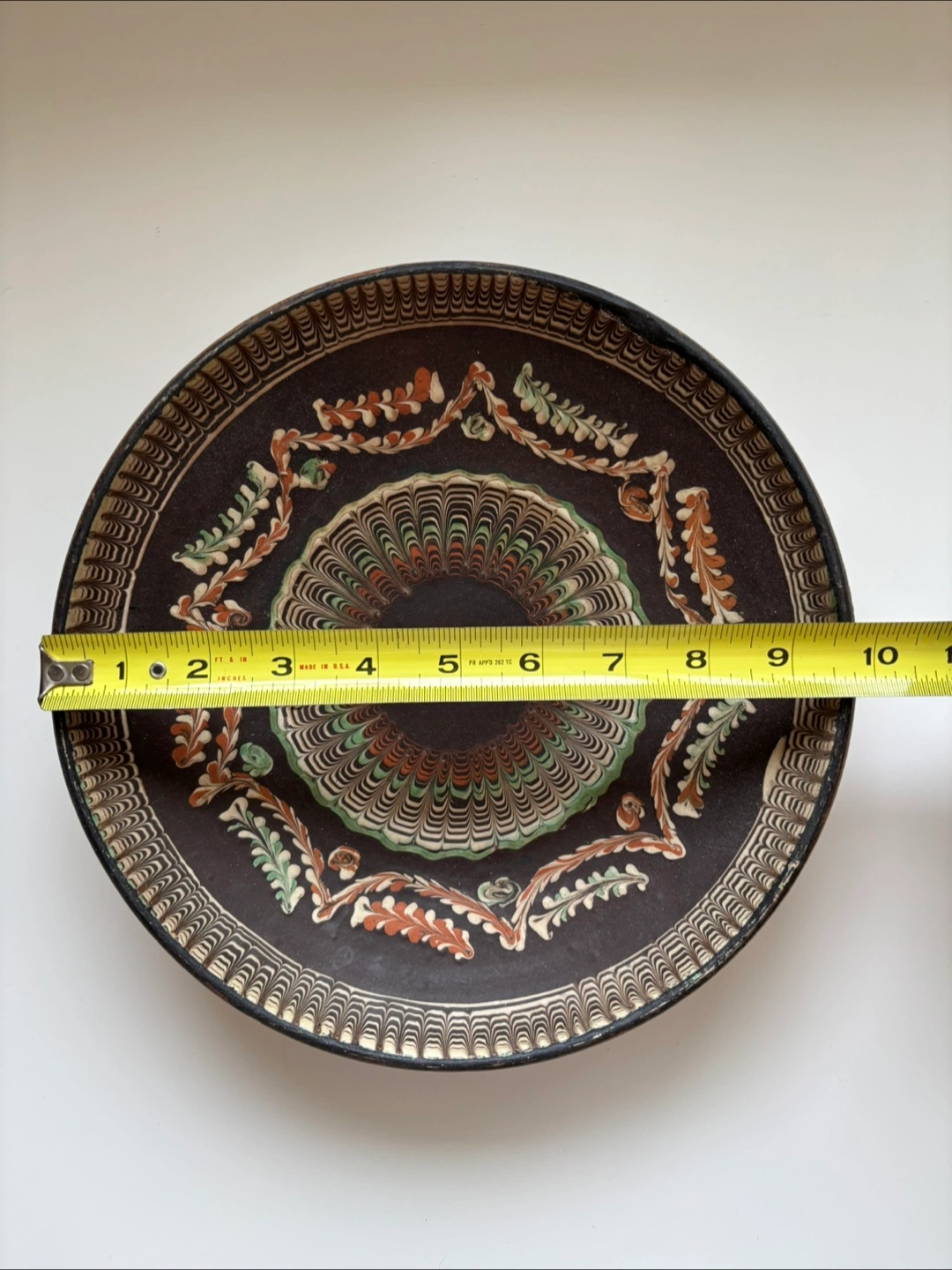 This is a vintage decorative plate with a unique design. It features intricate patterns in brown, green, and white on a dark background. The plate has a rustic charm and could be a great addition to your home decor