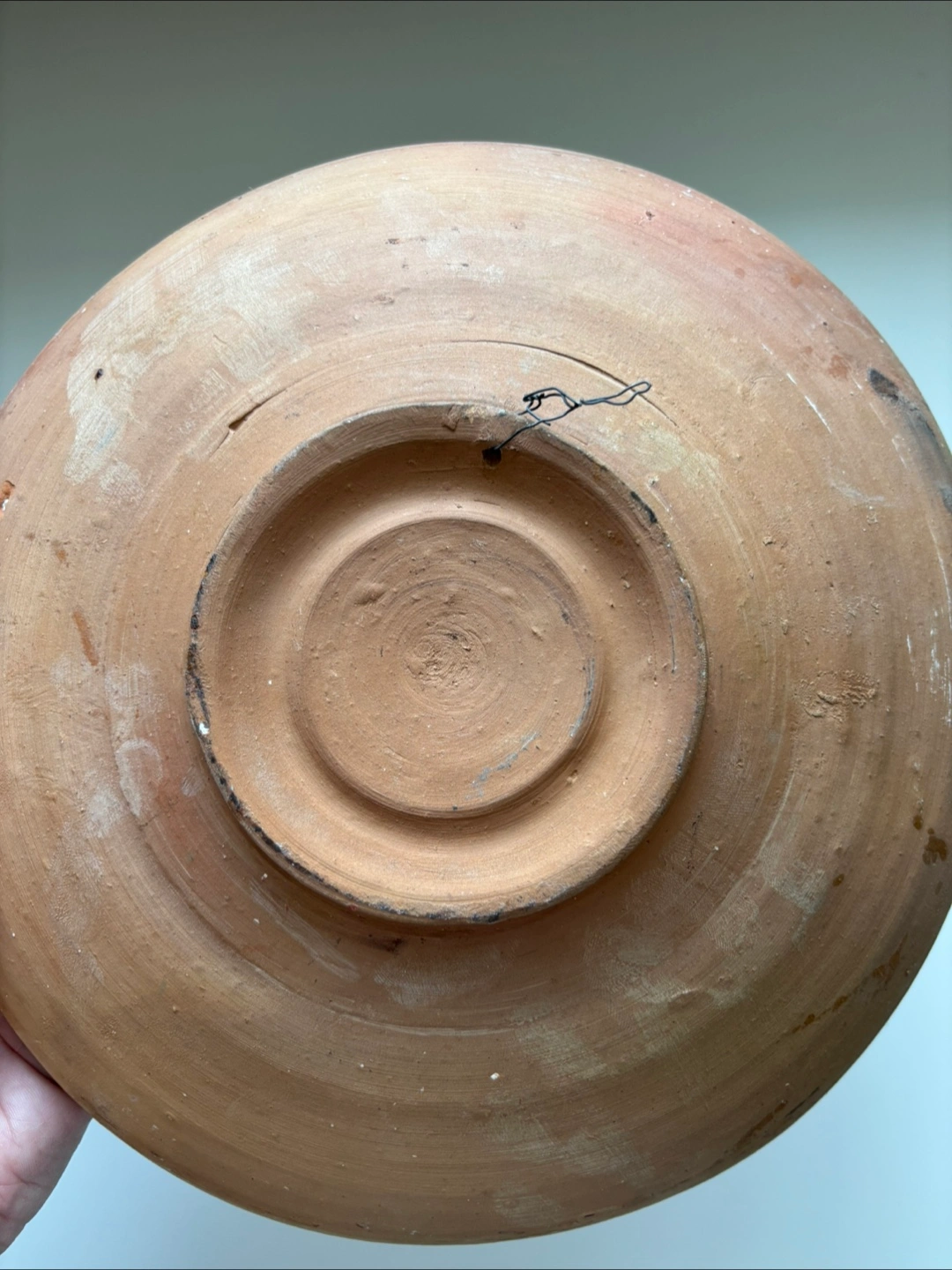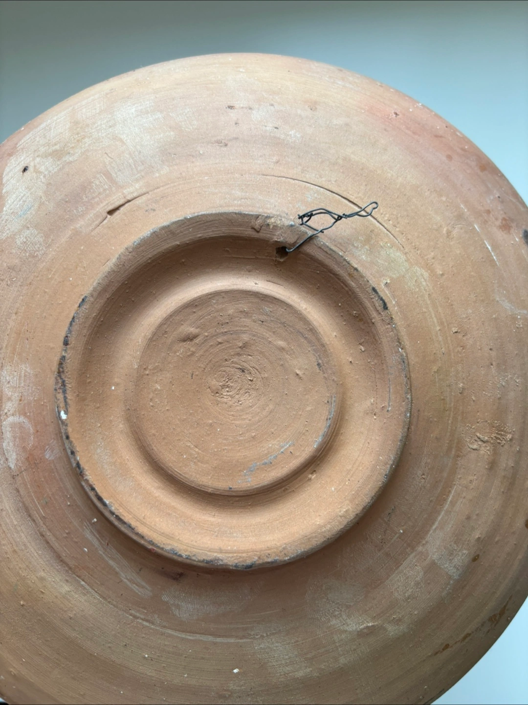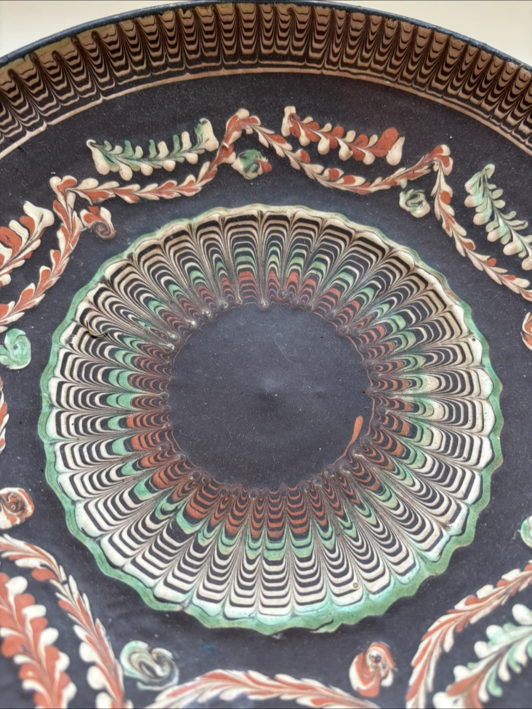This is a vintage decorative plate with a unique design. It features intricate patterns in brown, green, and white on a dark background. The plate has a rustic charm and could be a great addition to your home decor