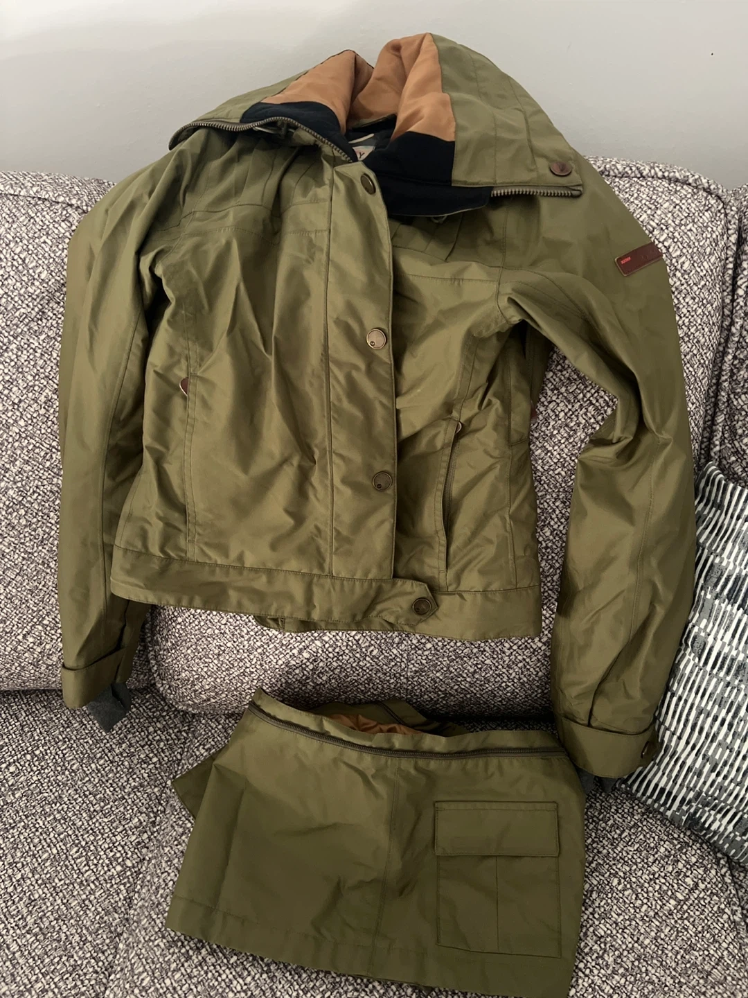 Selling a cute jacket and skirt set in an olive green colour! It's in great condition and ready for a new home. Perfect for transitioning between seasons!