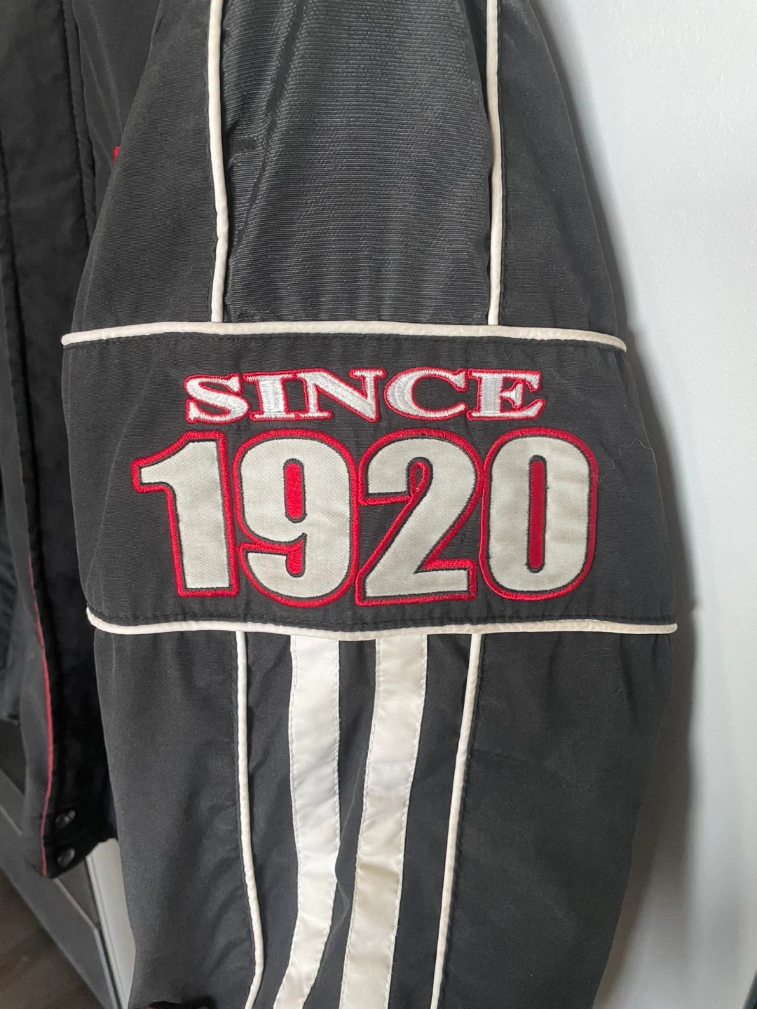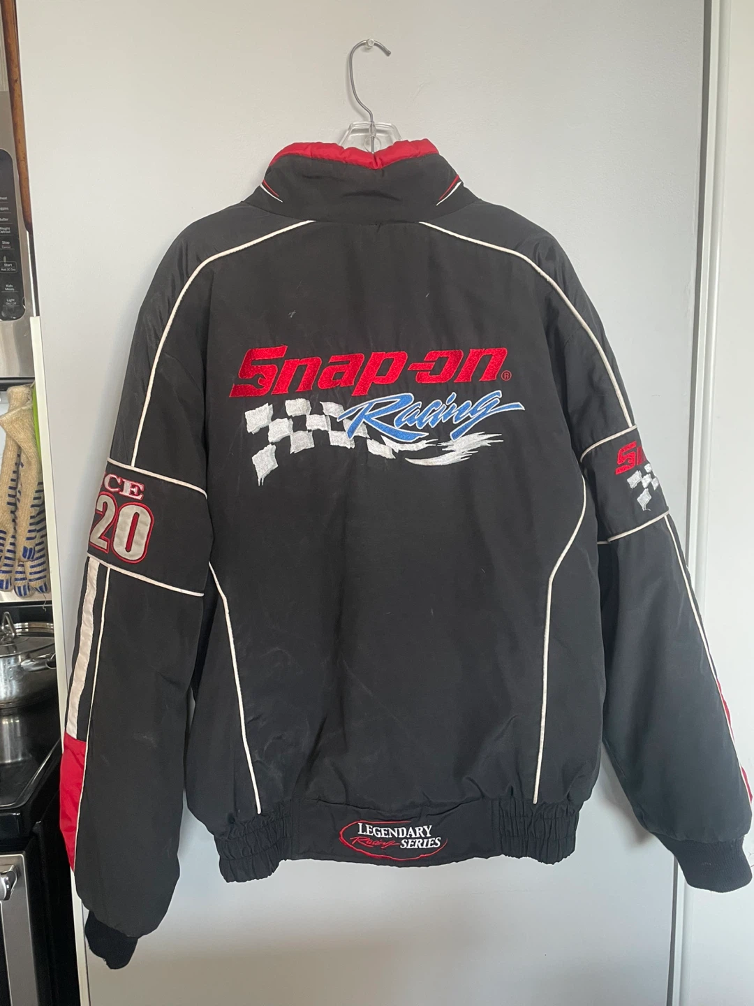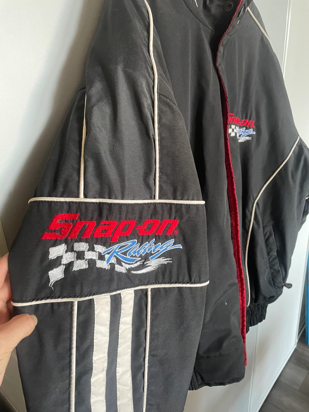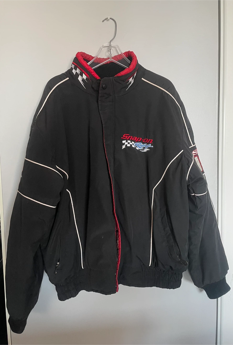 Selling a Snap-on Racing Legendary Series jacket. It's black with red and white accents. The jacket features the Snap-on Racing logo and a checkered flag design. It also has "Since 1920" embroidered on the sleeve. Embroidery is in great condition.