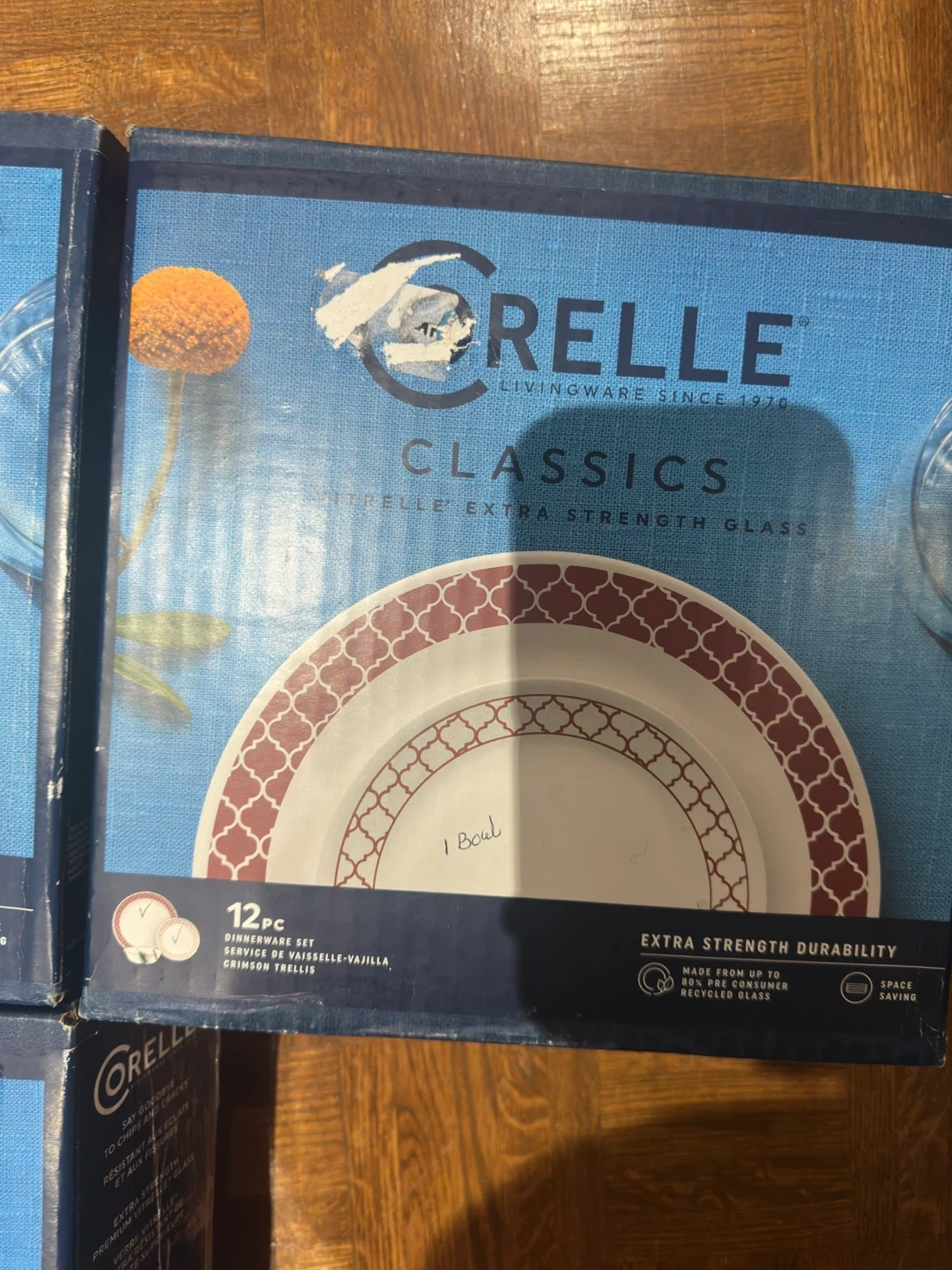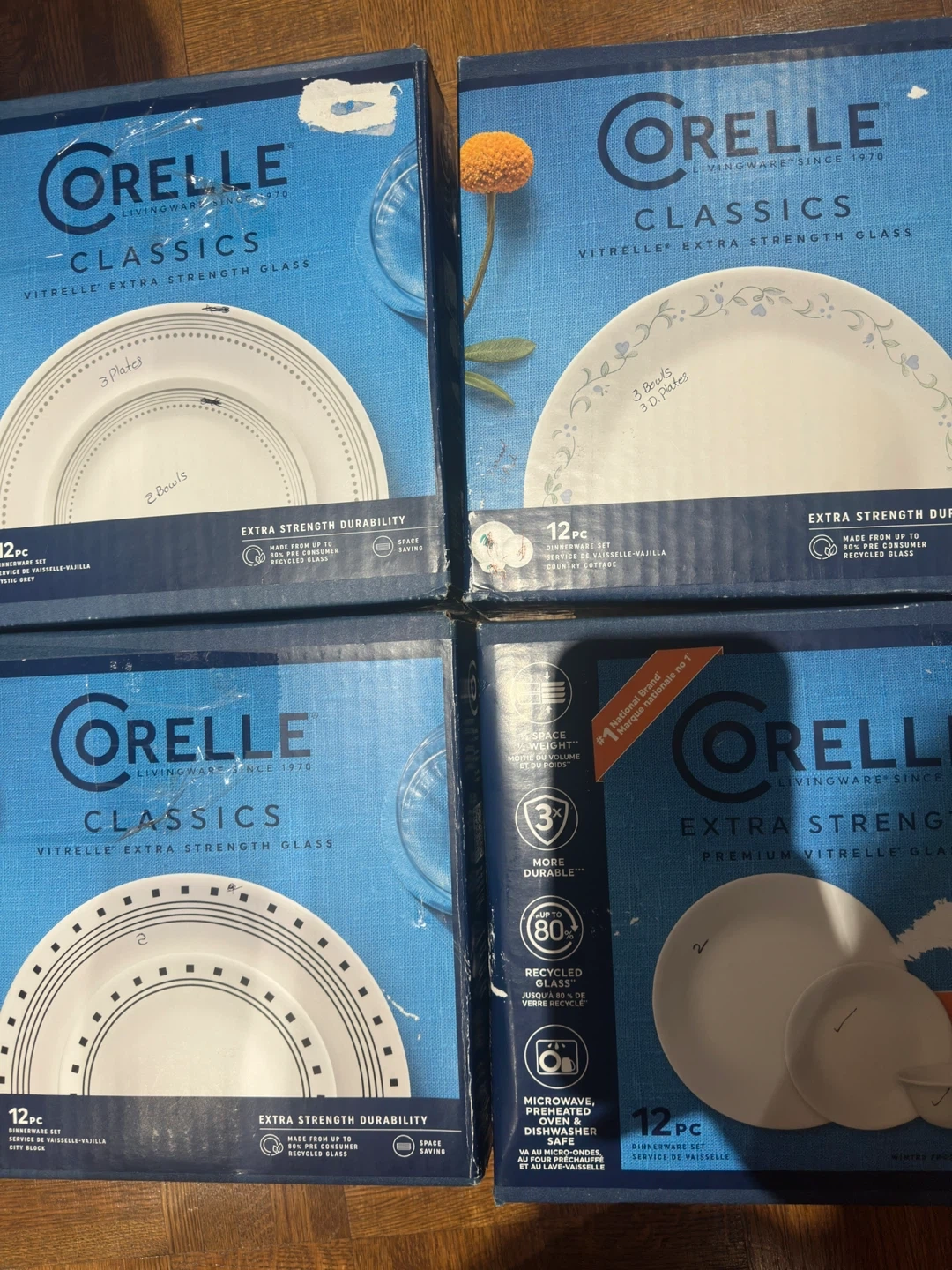 100Mississauga, Brandnew 12 pcs. Dinner set,Corning ware All sets have something missing pcs > •Red $35 1 big plate missing > •Black doted and plain set have 2 big plates missing $33 each One sets 3 big plates 2 bowls $24 Other set 3 big plates 3 bowls missing $20 Or individual $4/ piece any You can use it as addition in similar set