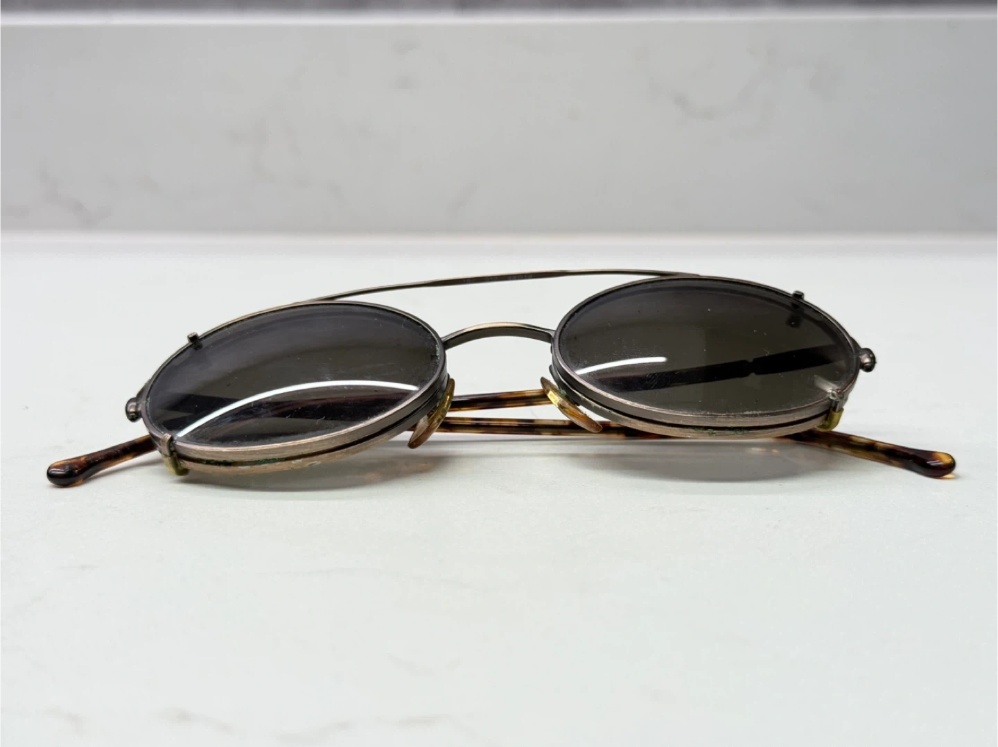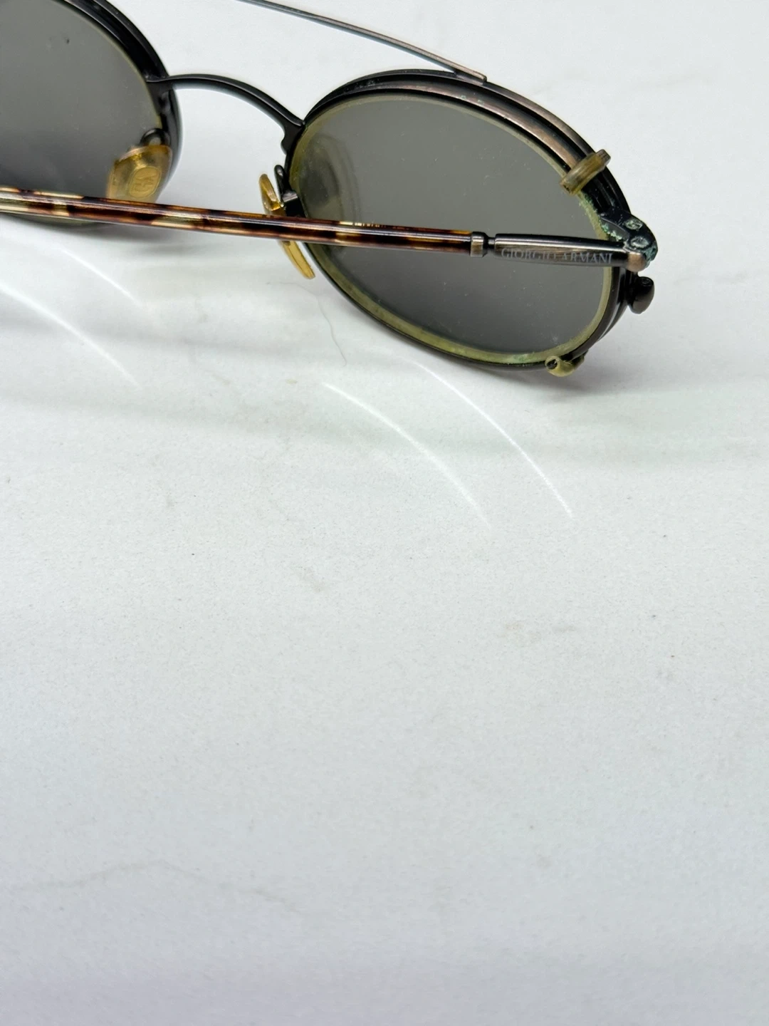 Selling a pair Vintage of Giorgio Armani sunglasses with clip-on lenses! They have a unique vintage look with round frames and tortoise shell temples.